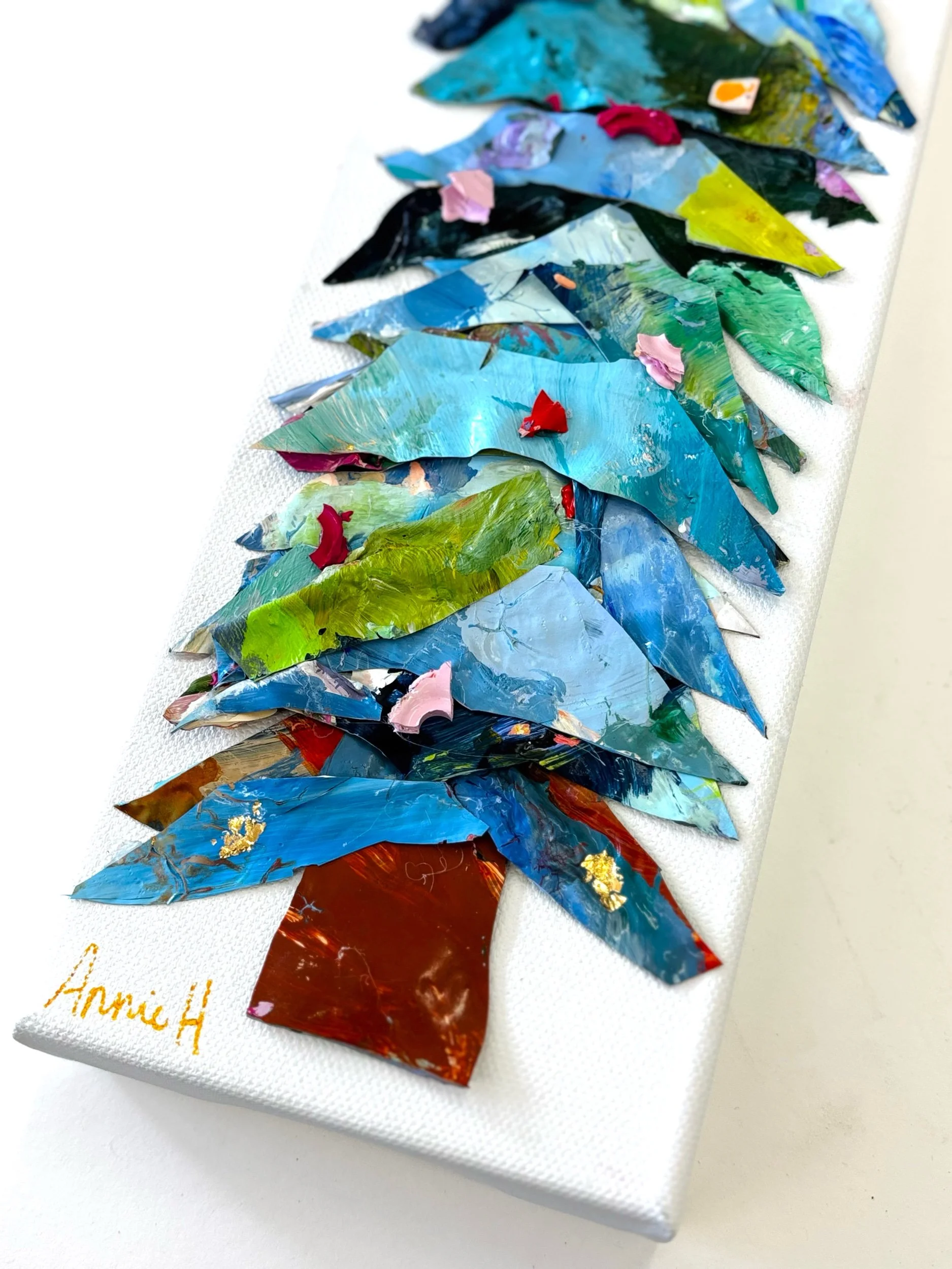 Inspired by winter skies and coastal blues, this Blue Palette Christmas Tree features layered strokes of navy, turquoise, sea glass, sky blue, and pops of soft pink and evergreen. Each piece is hand-cut from my studio paint palettes, giving the tree its signature texture and painterly charm. Crowned with a shimmering gold-leaf star, it’s a perfect blend of modern, coastal, and festive.