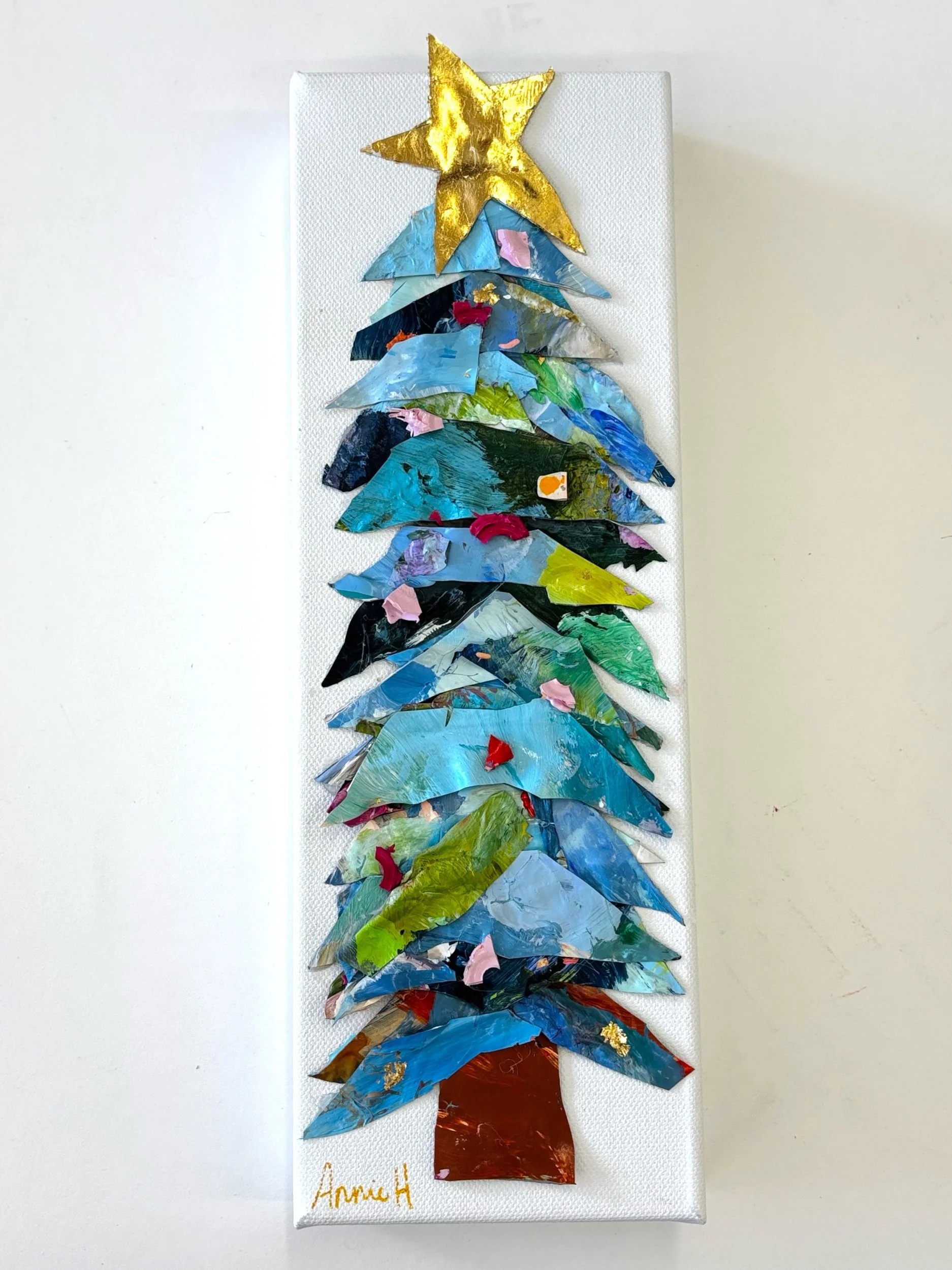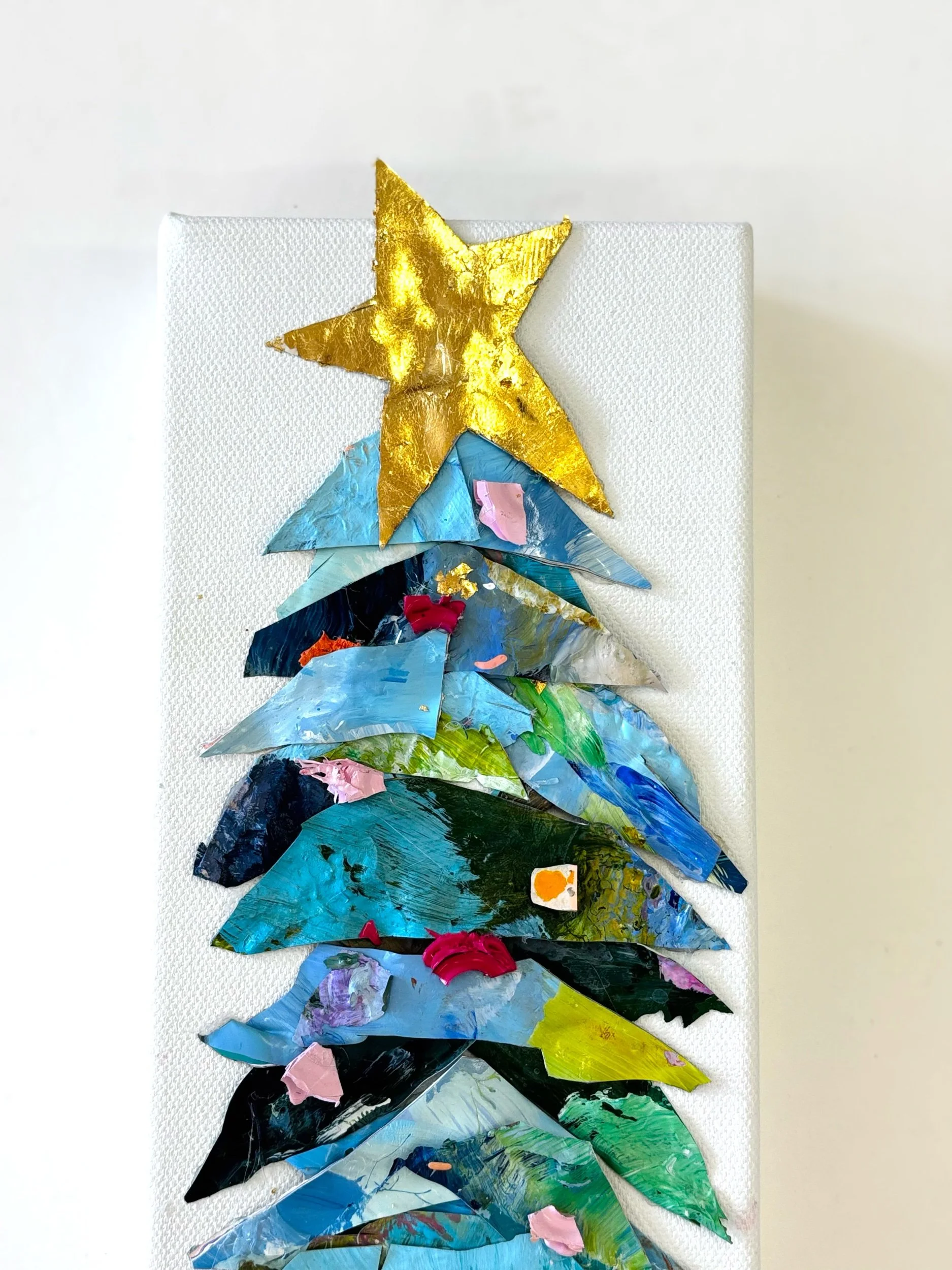 Celebrate the season with a one-of-a-kind Palette Christmas Tree, handcrafted from real paint palette remnants collected from my studio. Each sculptural tree features layered, hand-cut acrylic palette pieces, dimensional texture, and a signature gold-leaf star that catches the light beautifully.