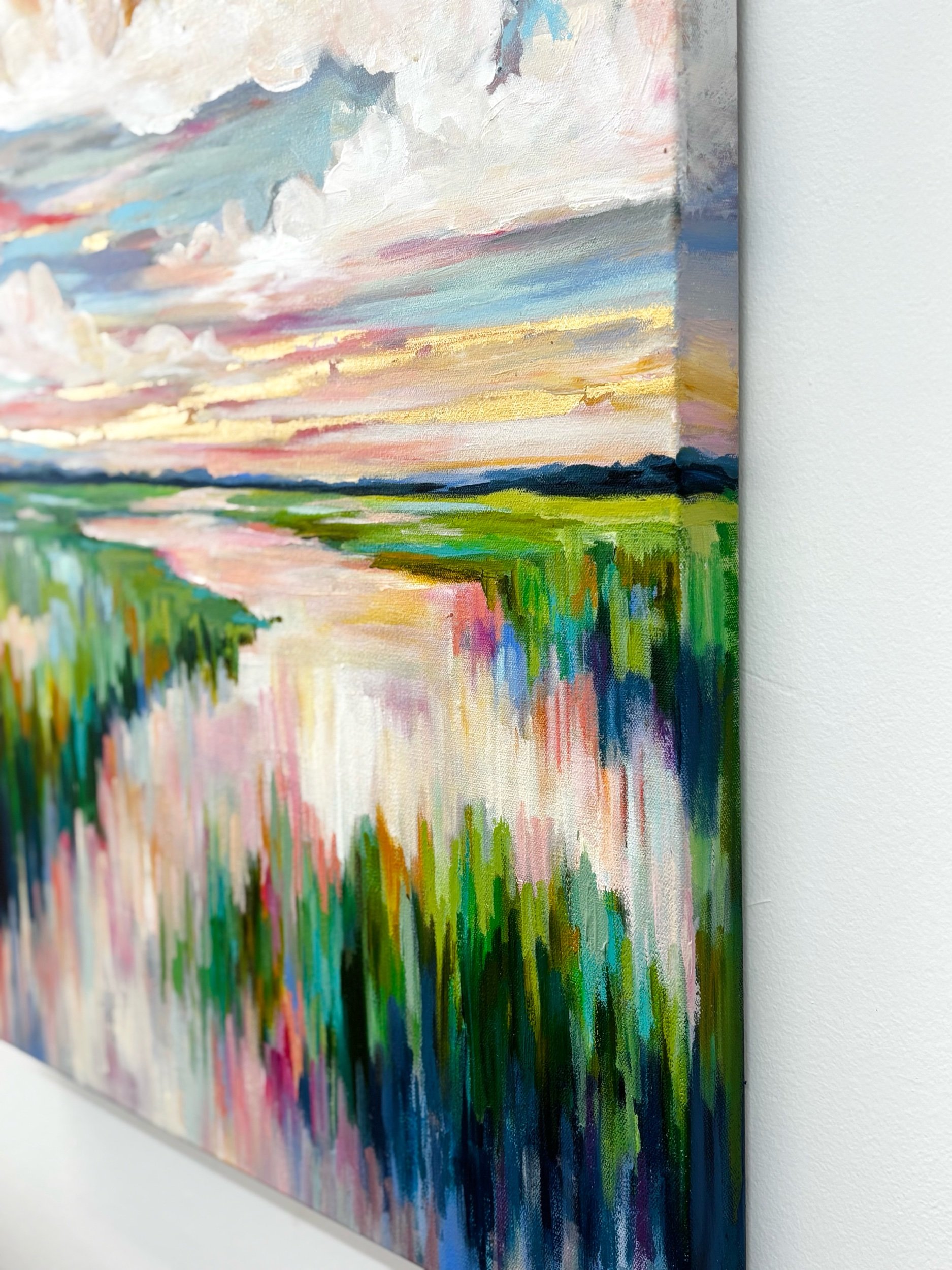 Perfect for lovers of marsh art, coastal décor, Southern landscapes, contemporary impressionism, and colorful modern interiors, “Chasing Daylight” serves as a statement piece that adds joy, serenity, and visual drama to any room