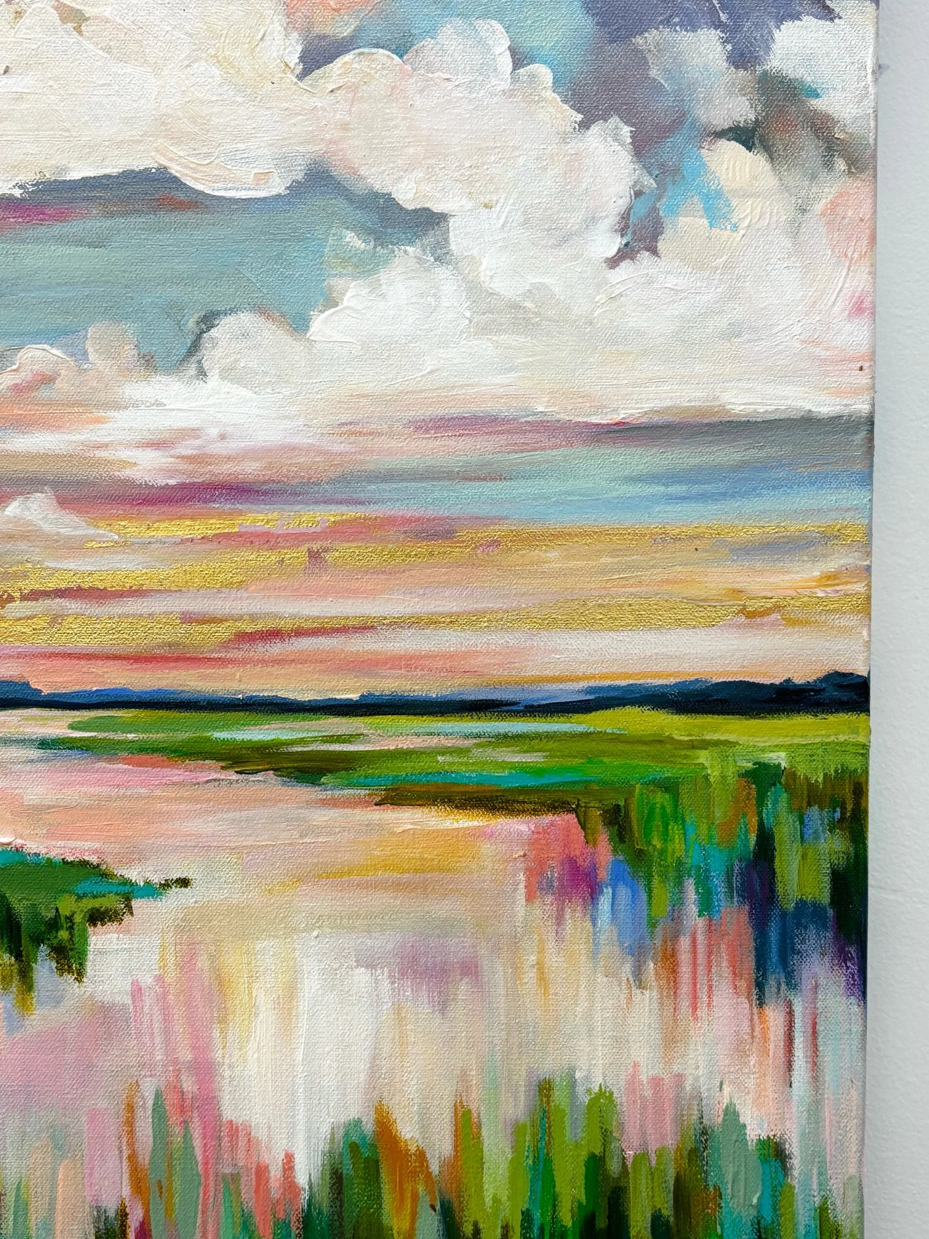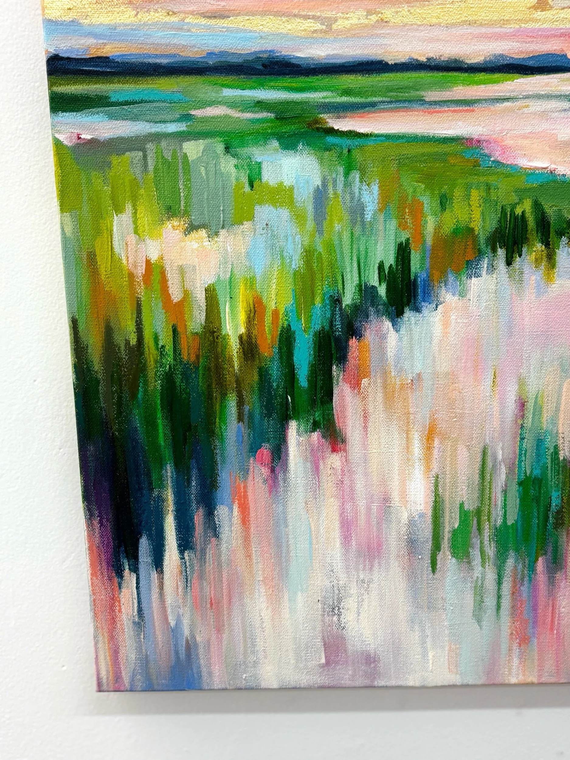 Chasing Daylight” is a 24x36 original mixed-media marsh painting that captures the breathtaking moment when the sky blooms with color and the water mirrors every shifting hue. This piece is filled with vibrant coastal tones, expressive brushwork, and shimmering gold-leaf accents, creating a luminous landscape that feels both energetic and peaceful.