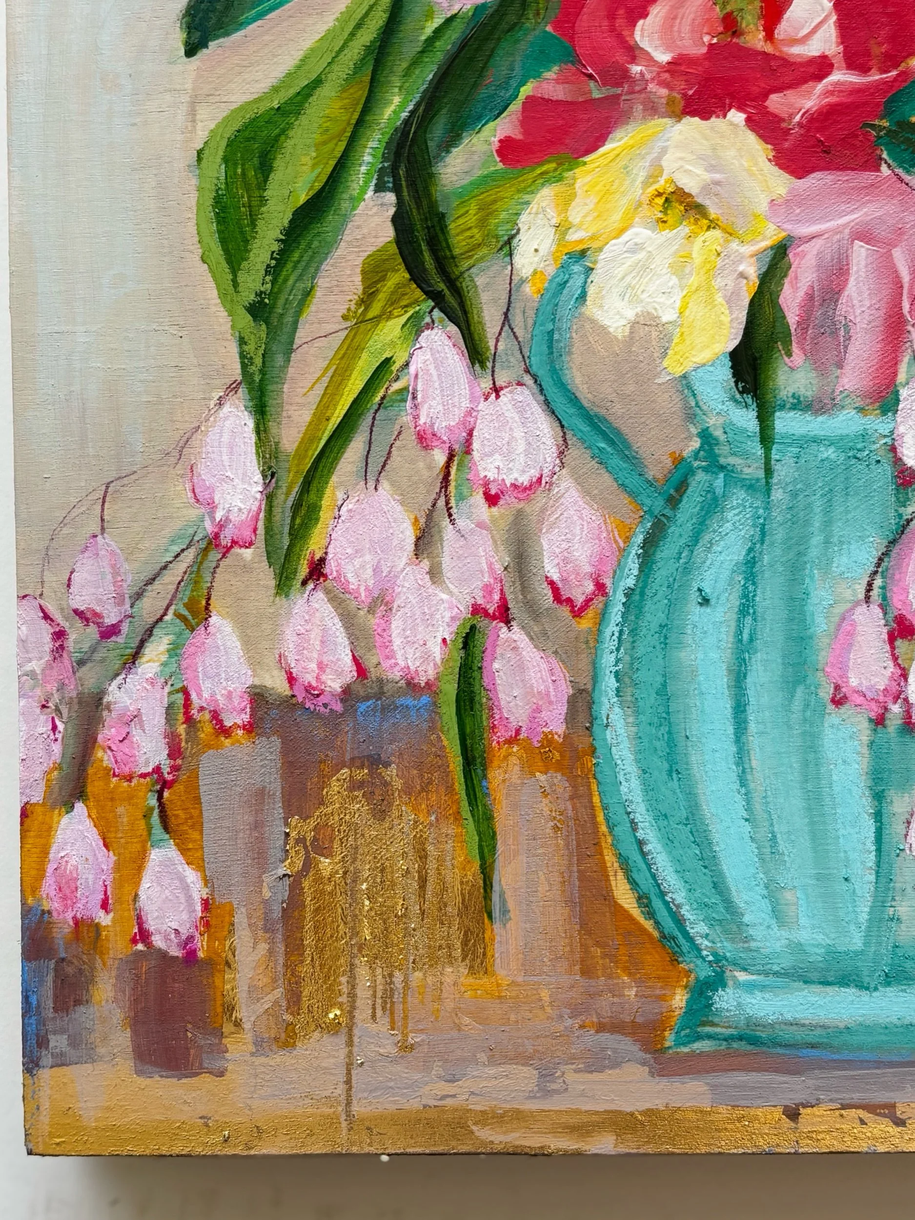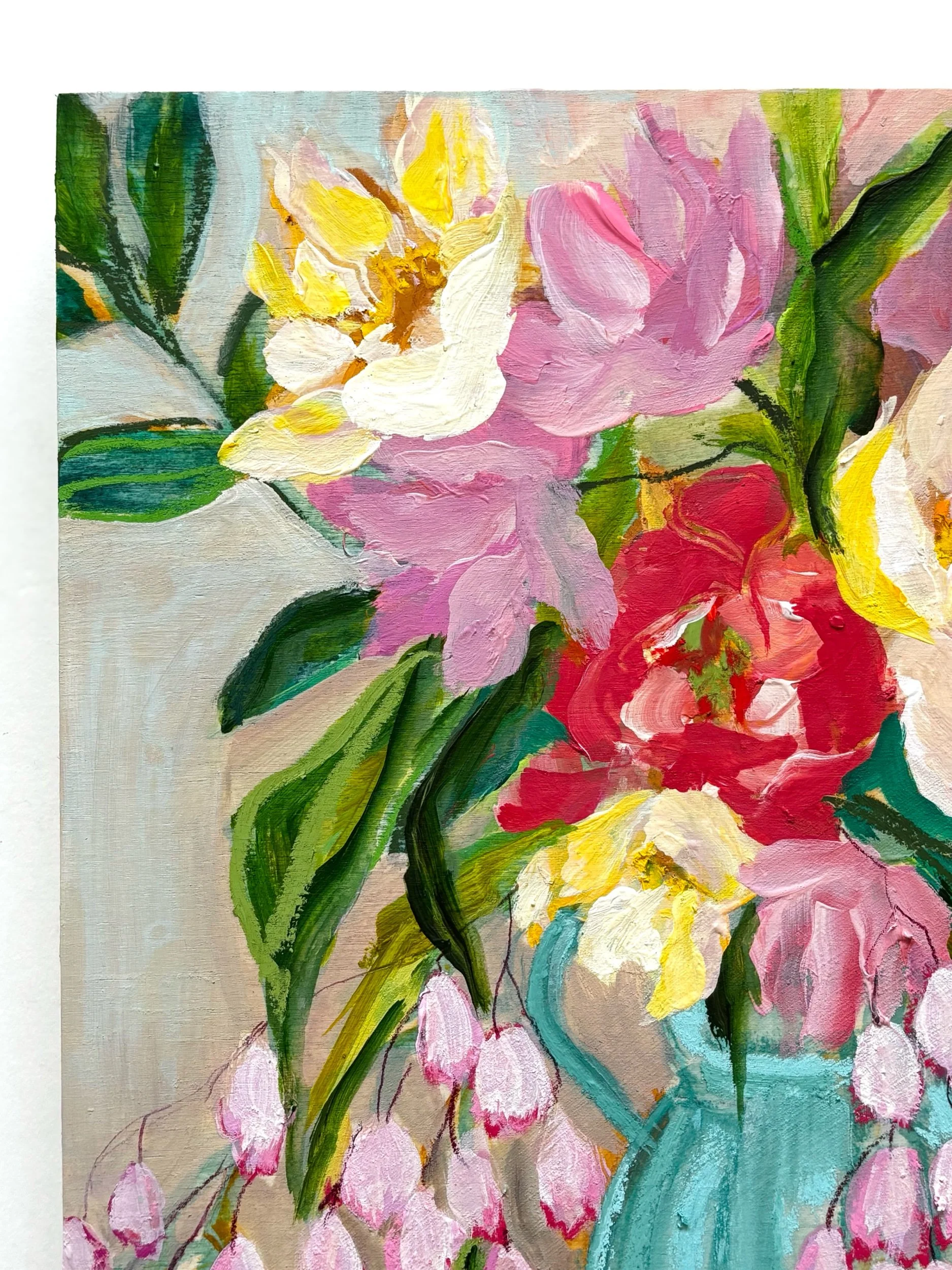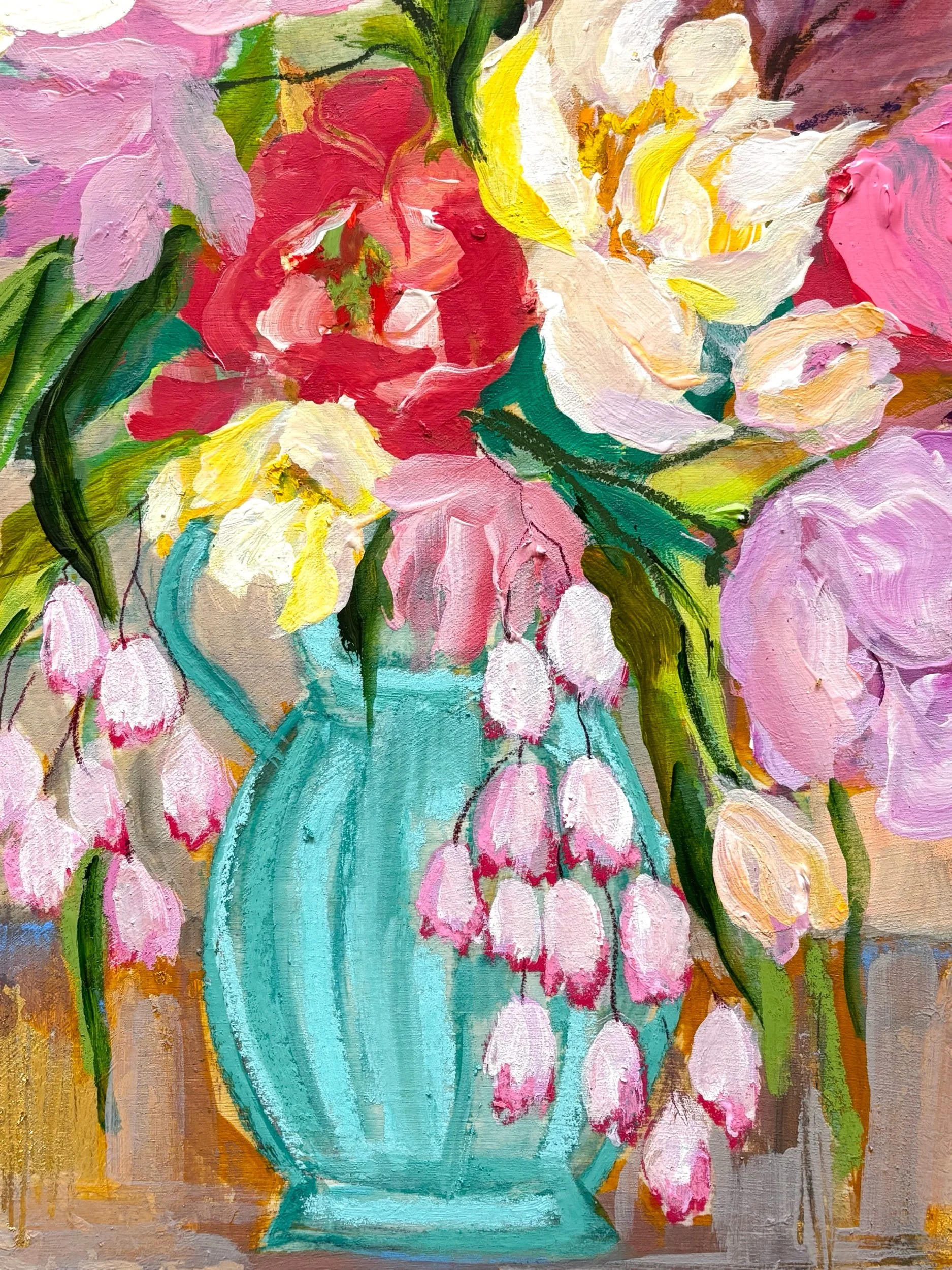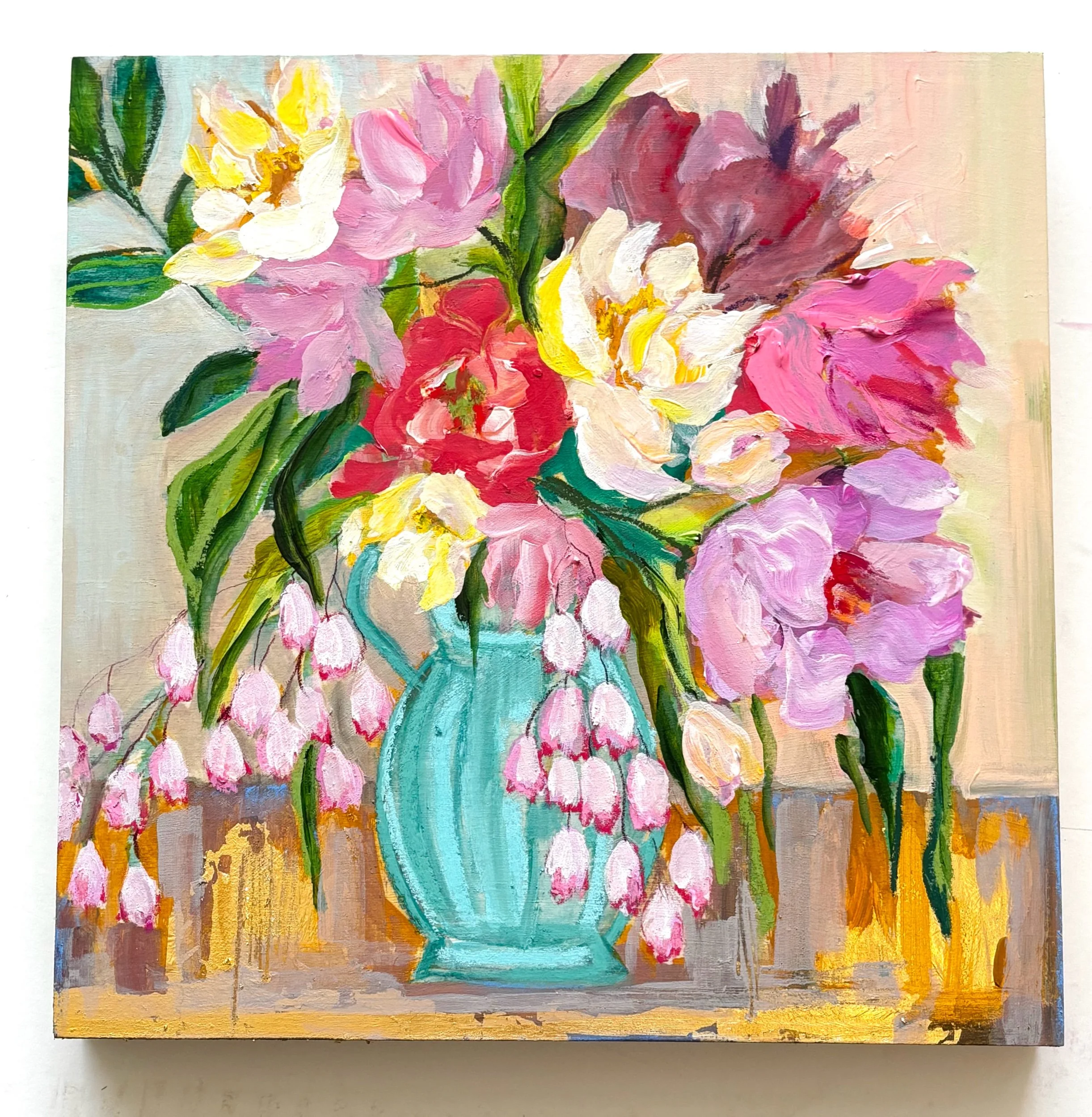 Spill the Blooms is pure joy — a color-splashed bouquet that feels spontaneous, confident, and full of movement. Painted in Annie Howell’s expressive mixed-media style, this 12x12 original bursts with lush peonies, buttery yellows, and soft pinks cascading from a turquoise vase.