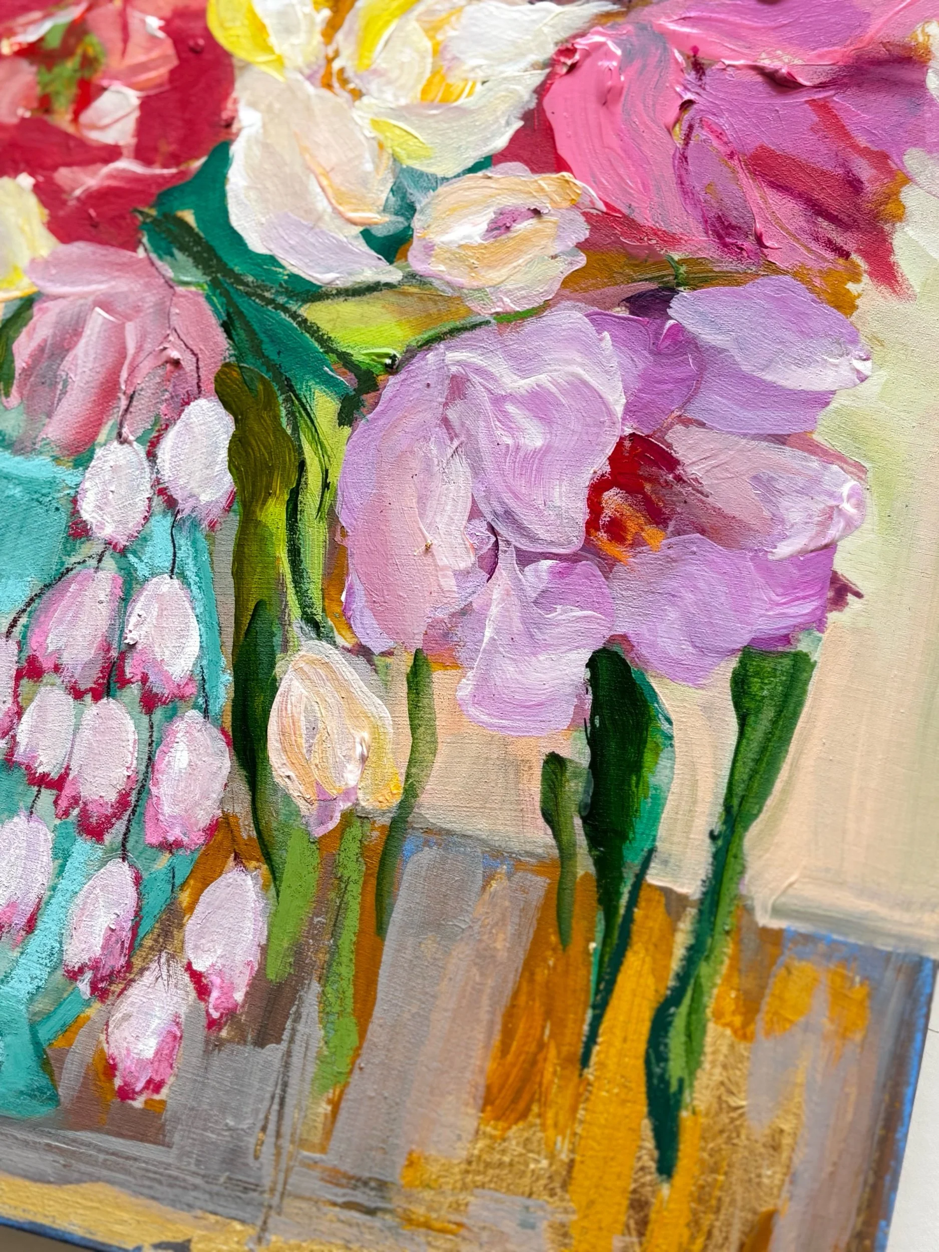 With hints of gold and bold brushstrokes, Spill the Blooms captures that perfectly imperfect beauty of flowers in motion — vibrant, feminine, and joyfully uncontained. Perfect for collectors who love statement florals with personality and color that carries you.
