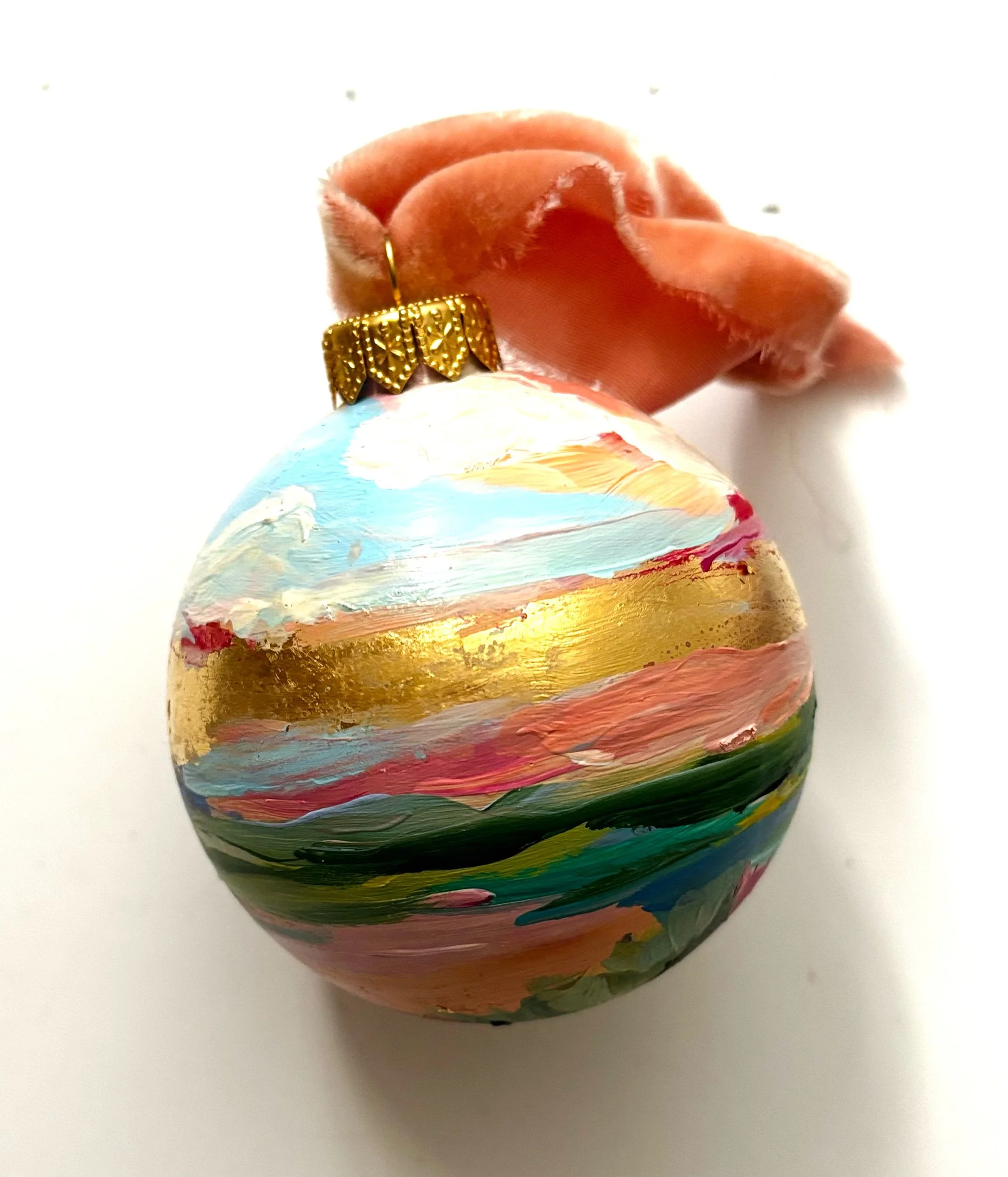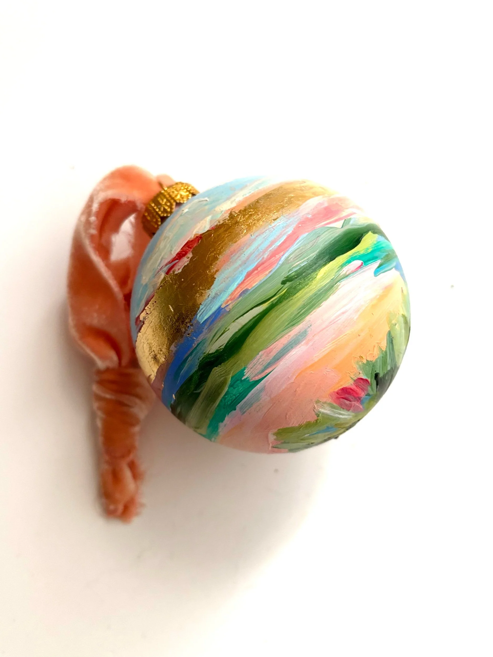 Crafted on a substantial ceramic base, every ornament includes rich texture, vibrant color, and hand-applied gold leaf details that catch the light beautifully. Finished with a luxe velvet ribbon, they’re perfect for gifting, decorating, or adding to your annual ornament collection.