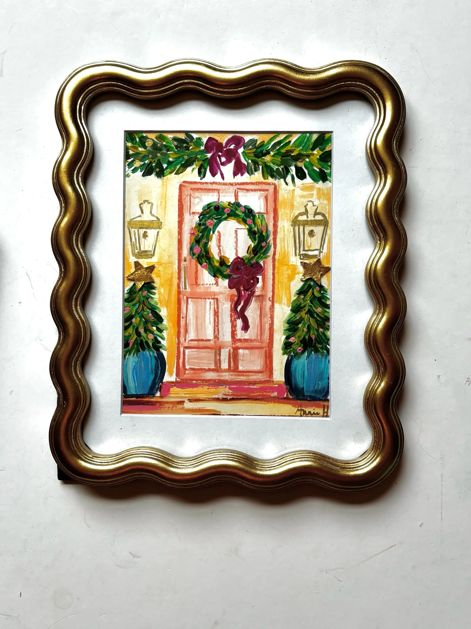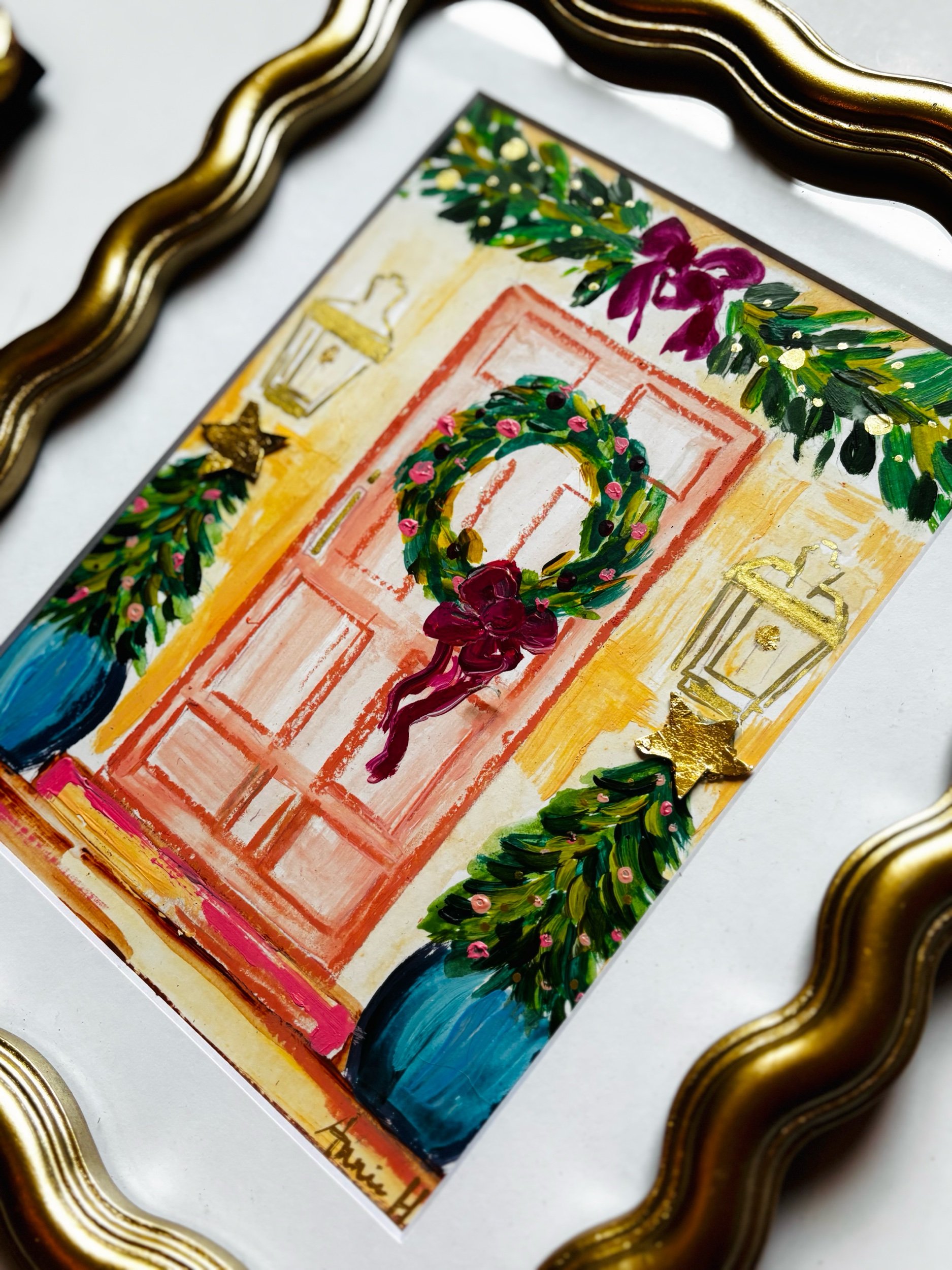 Home for the Holidays — Original Christmas Door Collection. Each piece features a 6x8 original on paper framed in an 8x10 gold frame.