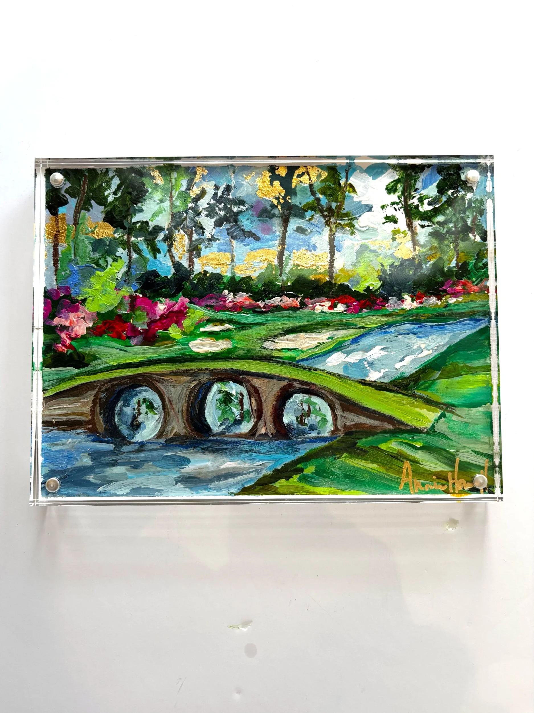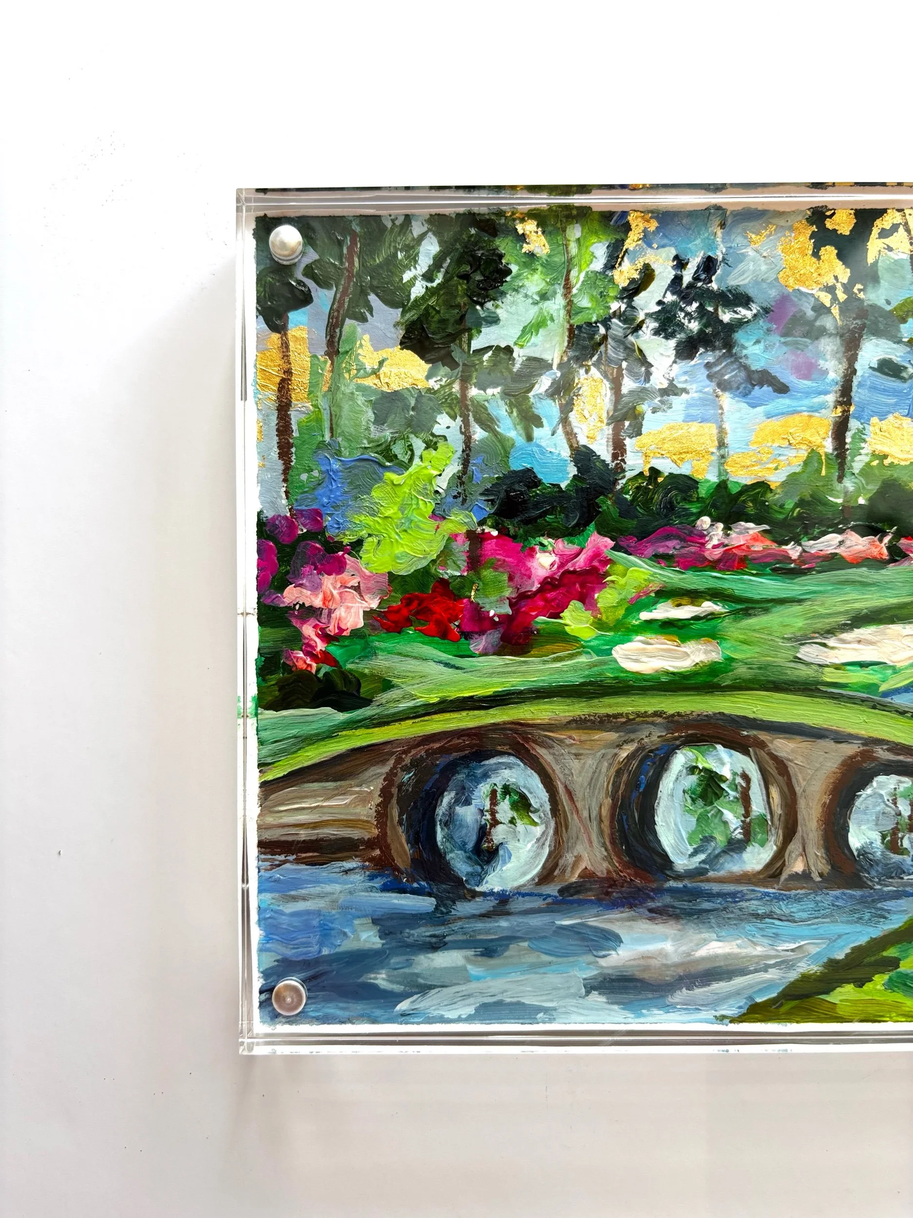 Amen Corner in Bloom captures one of the most iconic and beloved views in golf, reimagined through expressive color, movement, and texture. Inspired by Augusta in the spring, this piece brings together lush greens, vibrant azaleas, and the gentle curve of the bridge—an unmistakable moment where nature and tradition meet.