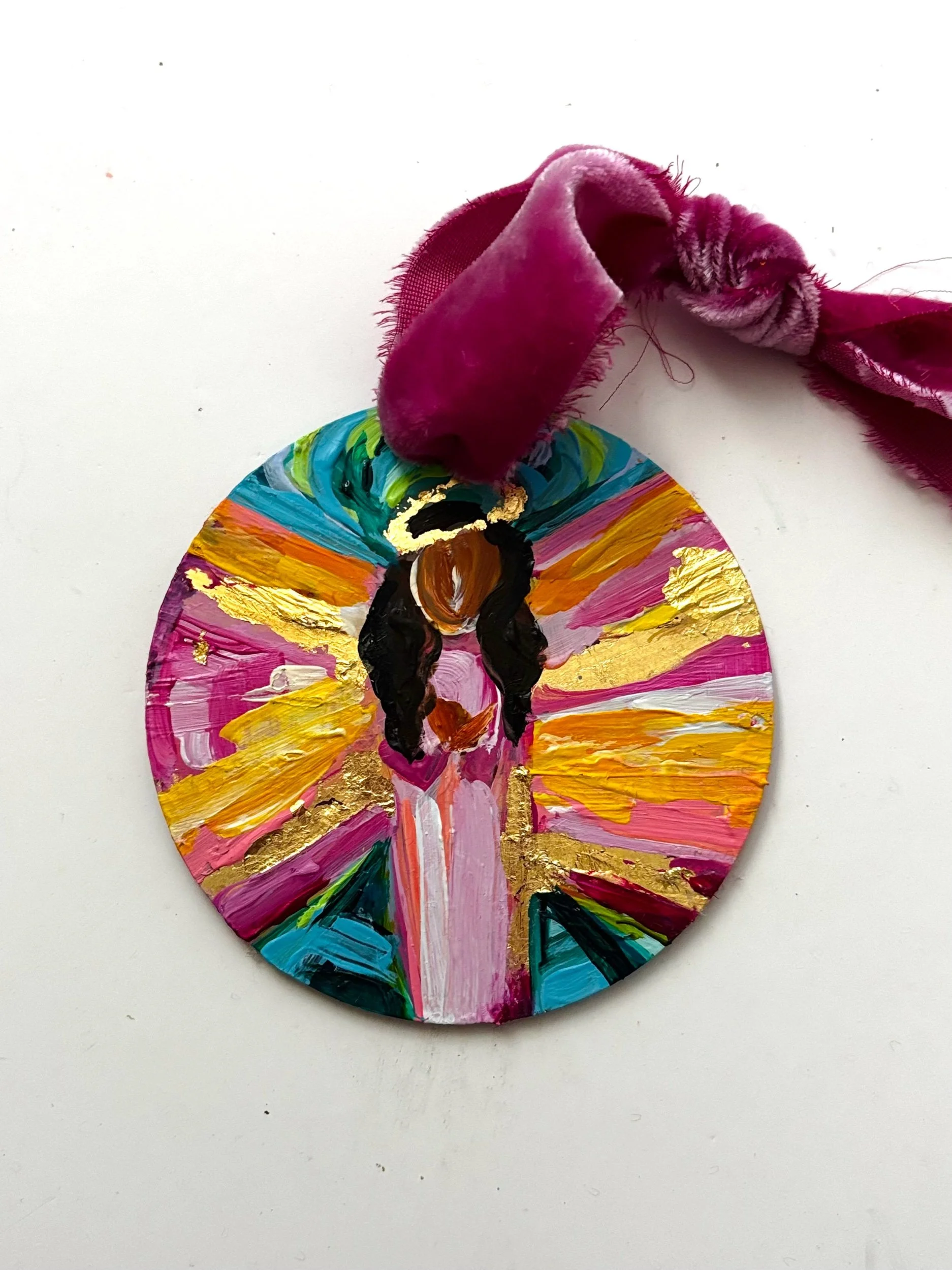 These 3” hand-painted acrylic ornaments are tiny works of art, designed to bring color, light, and joy to your holiday season. Each ornament is painted on a clear acrylic disc, allowing light to shine through the layered brushstrokes, vibrant hues, and delicate gold leaf details. Finished with a soft hand-tied ribbon, every piece feels playful, elevated, and one-of-a-kind.