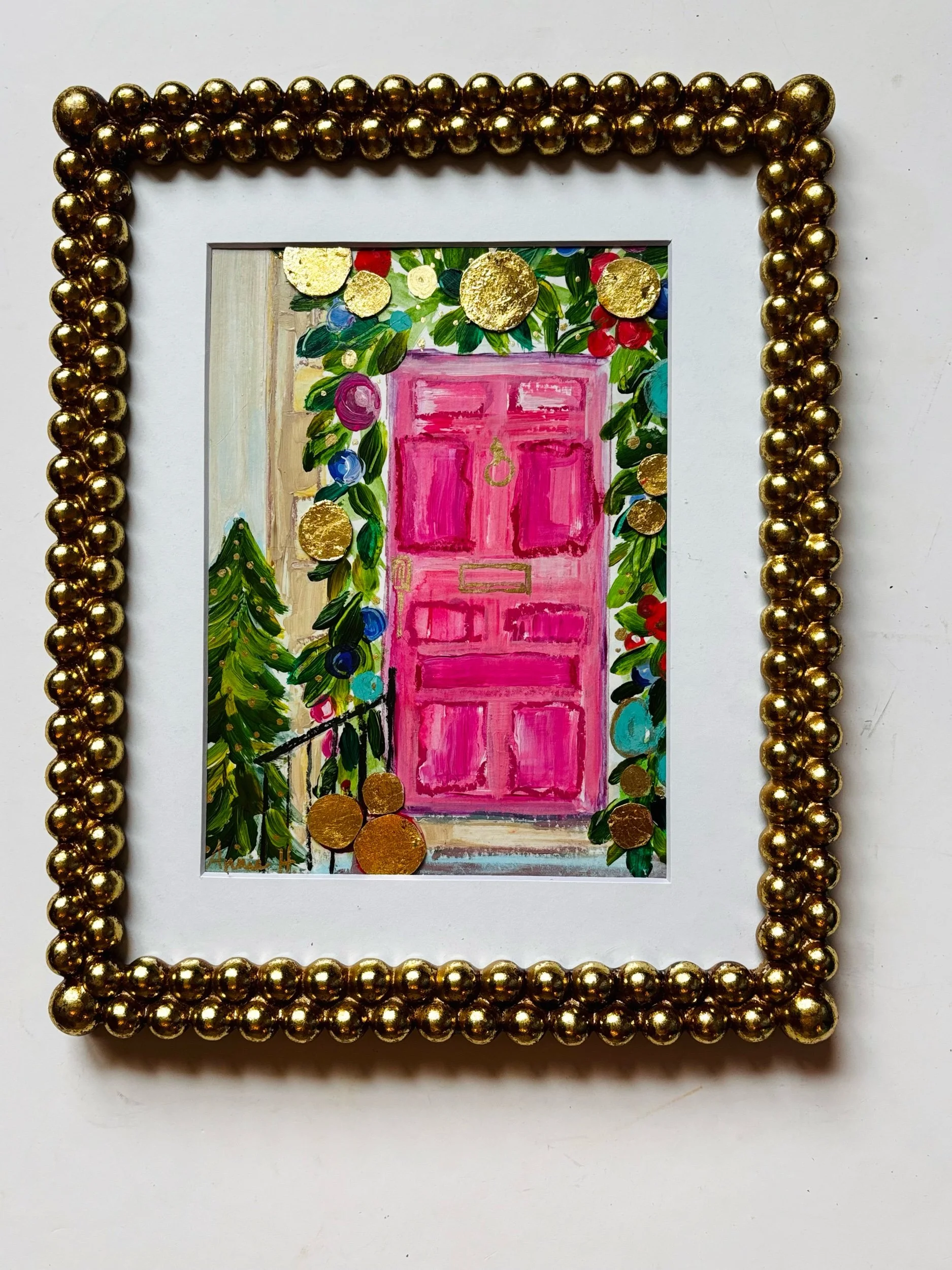 Step into the season with my Home for the Holidays collection — a series of festive front doors inspired by the magic, nostalgia, and warmth of Christmastime. Each piece celebrates the charm of a welcoming entryway: twinkling lights, winter greenery, classic wreaths, and joyful bows in my signature vibrant palette. Whether you’re decorating your own home or gifting something meaningful, these originals capture the feeling of stepping into a place filled with love, tradition, and holiday wonder. Perfect for collectors who treasure cozy memories, seasonal décor, and art that tells a story.A vibrant fuchsia door surrounded by festive garland and shimmering gold accents — playful, bright, and full of personality. This piece brings an unexpected pop of color to holiday décor while still feeling nostalgic and cozy. Perfect for collectors who love bold hues and joyful seasonal charm.