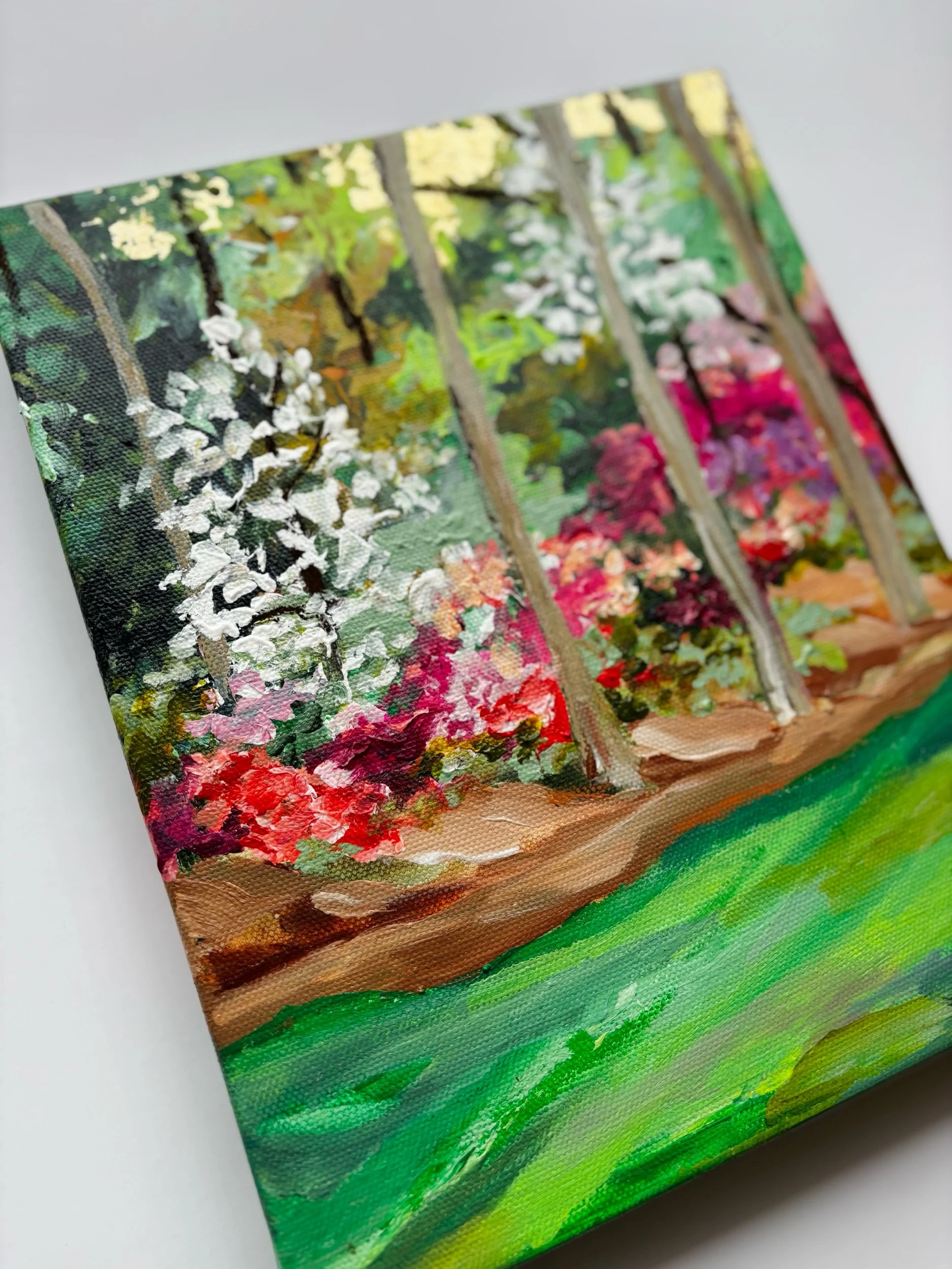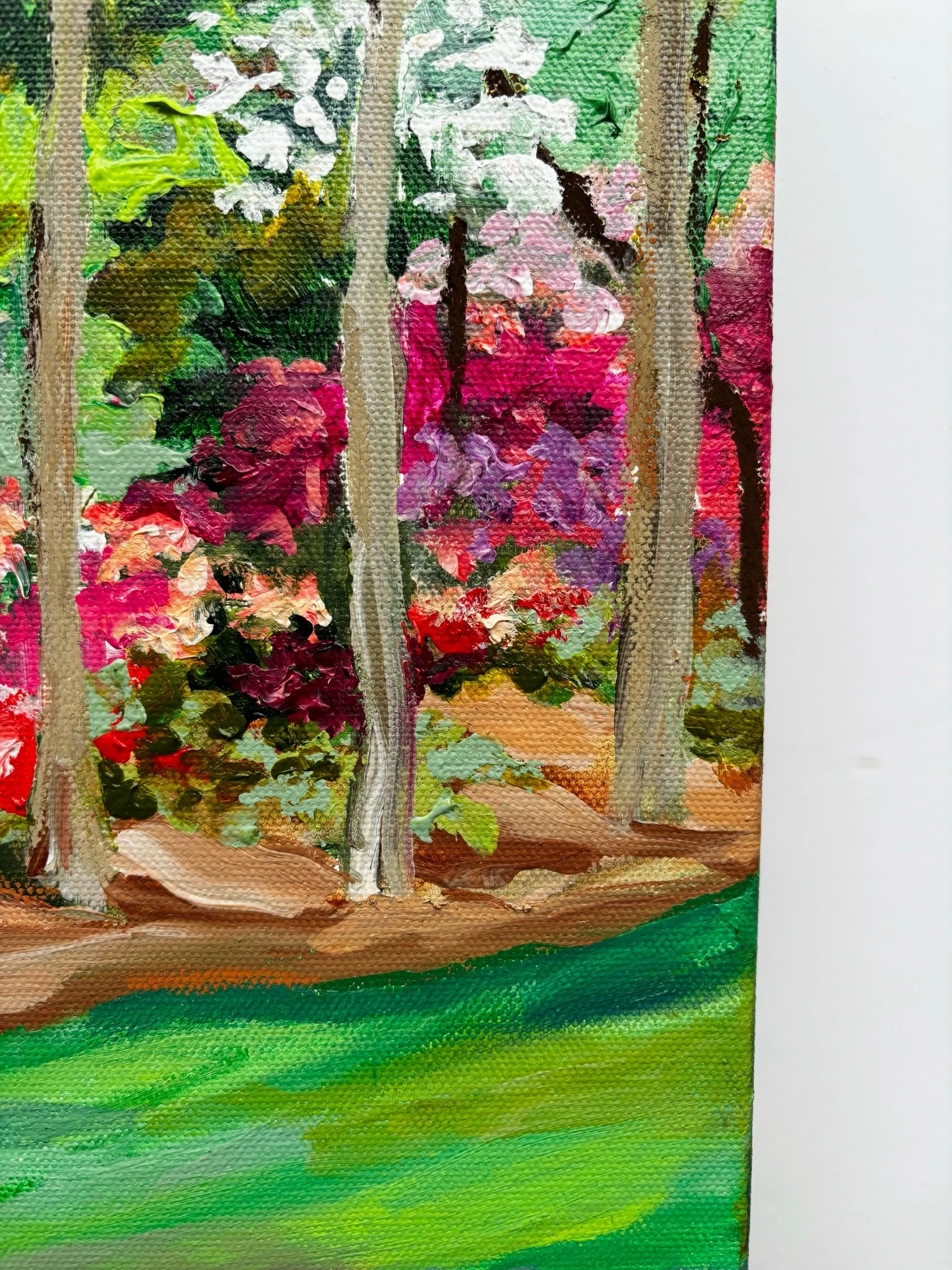 Inspired by the layered beauty of Augusta in full bloom, this original painting captures a quiet moment tucked beneath the trees—where vibrant azaleas spill across the landscape in rich pinks, reds, and soft whites.
