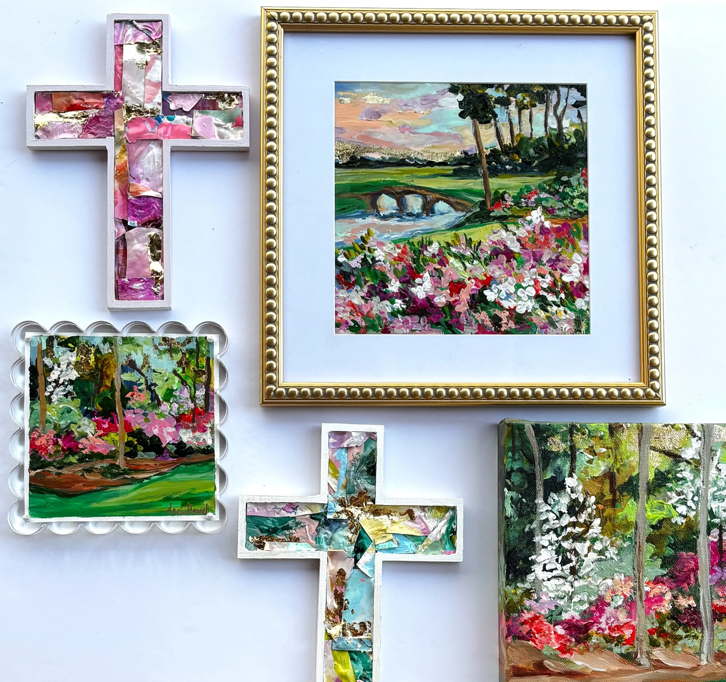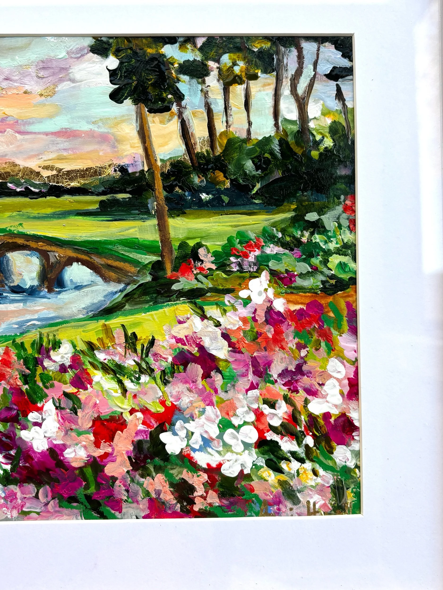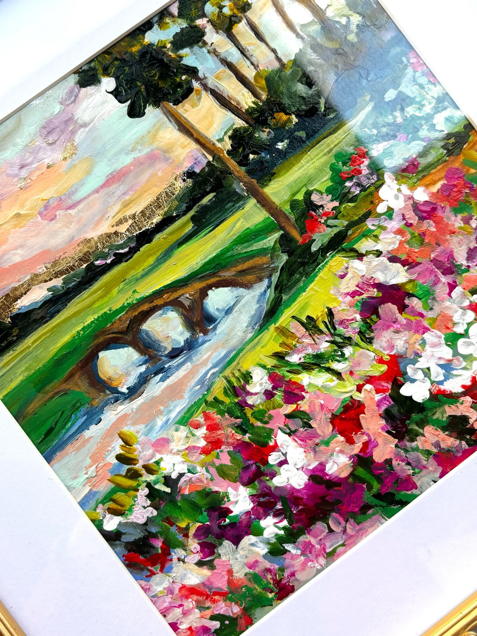 Rich with texture and movement, this piece brings the viewer into the garden itself. Thick, expressive brushstrokes and pops of color create a sense of depth and abundance, while subtle gold leaf accents catch the light—adding a hint of warmth and elegance.