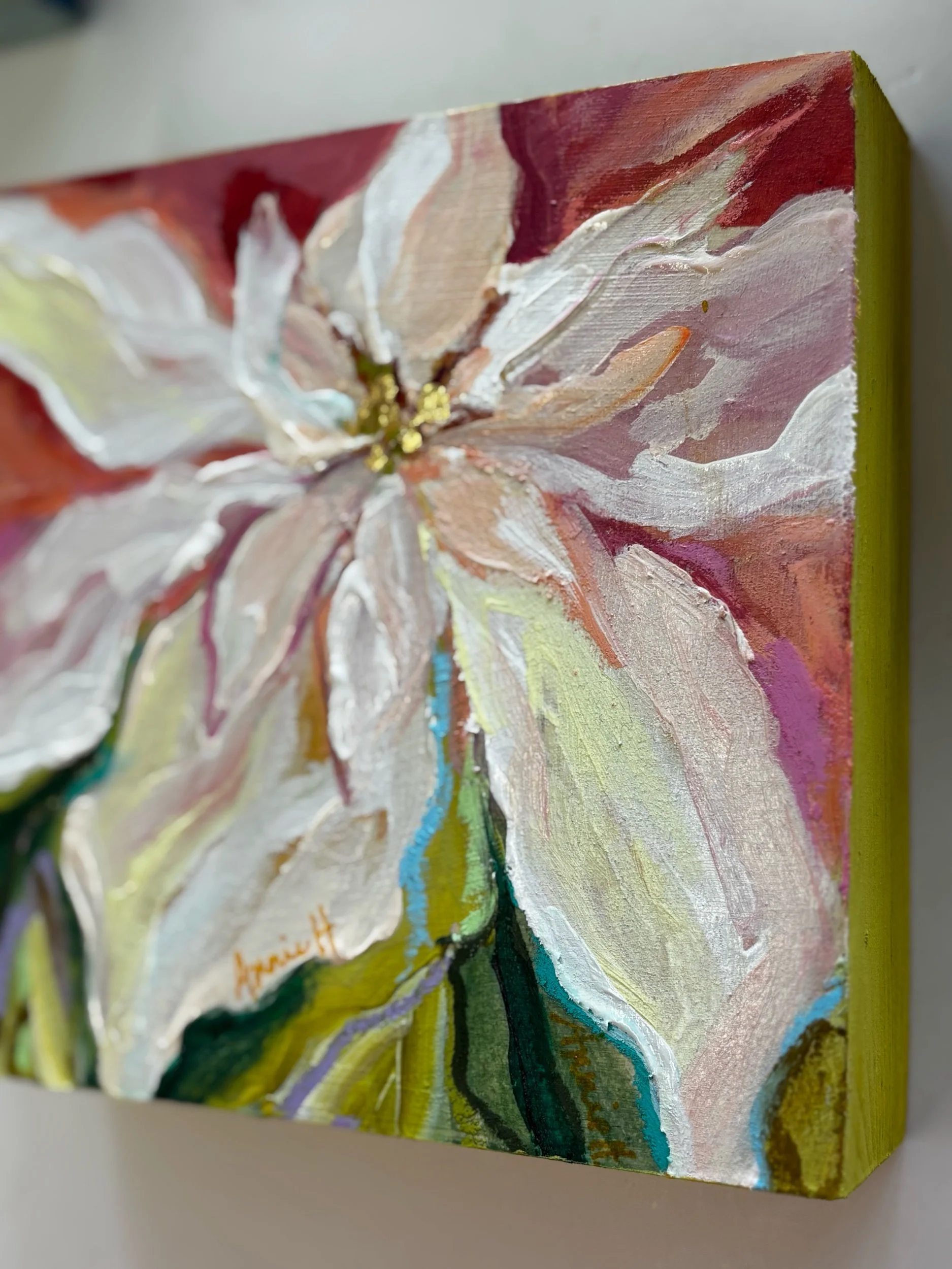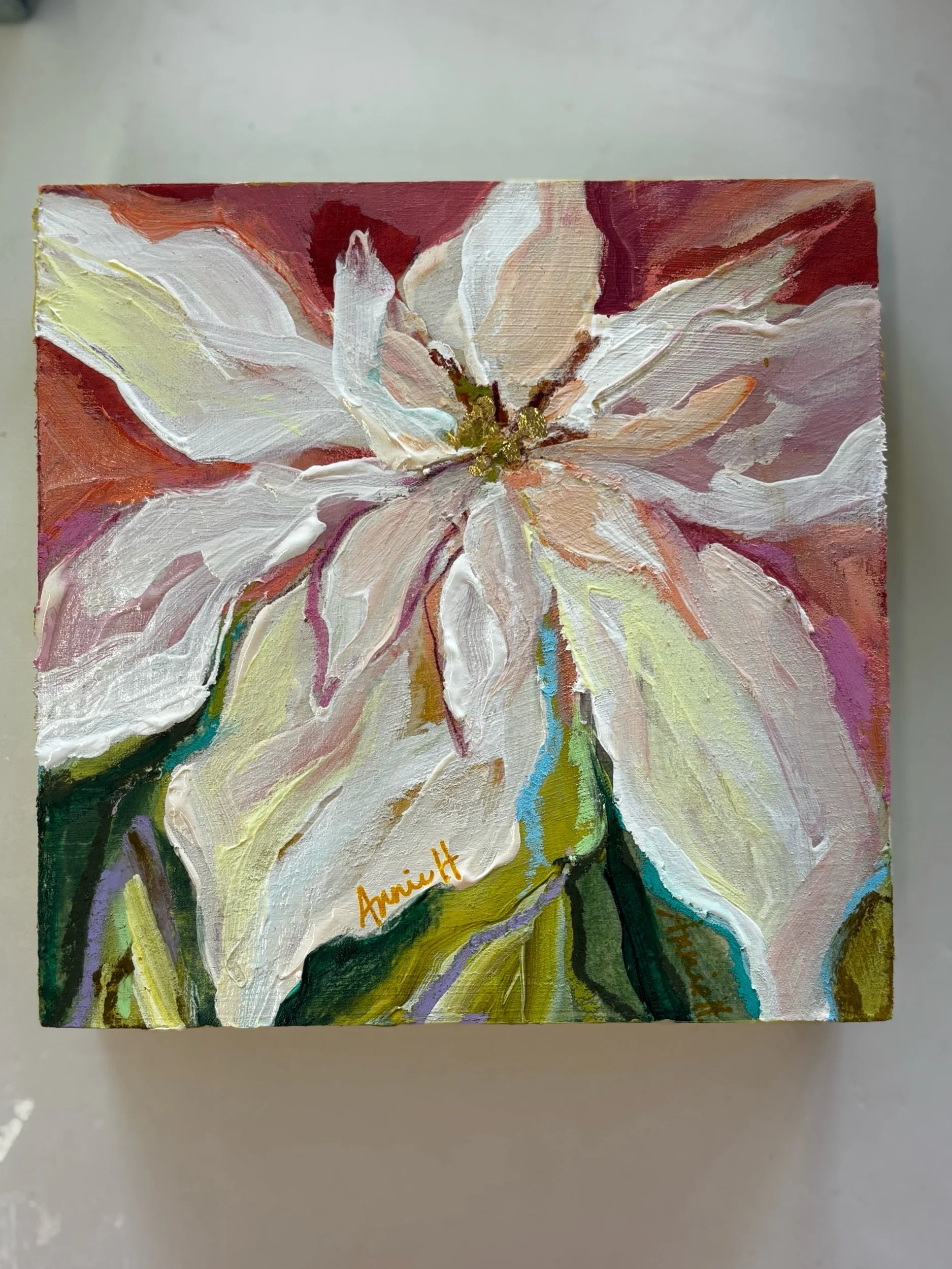 This soft and elegant 6x6 white poinsettia original brings a peaceful glow to your holiday décor. Layered brushstrokes in warm whites, blush pinks, creams, and soft yellows unfold across a rich red background, giving the bloom striking contrast and radiant depth. The textured petals feel sculptural, and touches of gold in the center add a subtle festive shimmer.