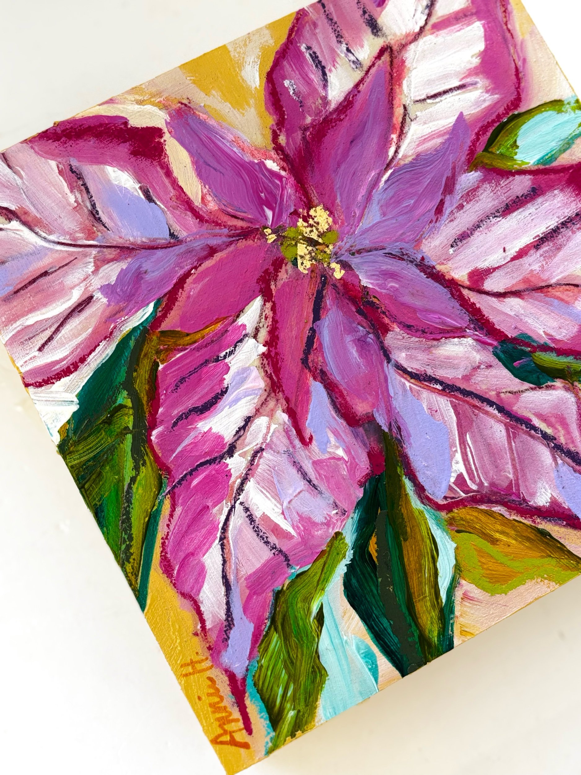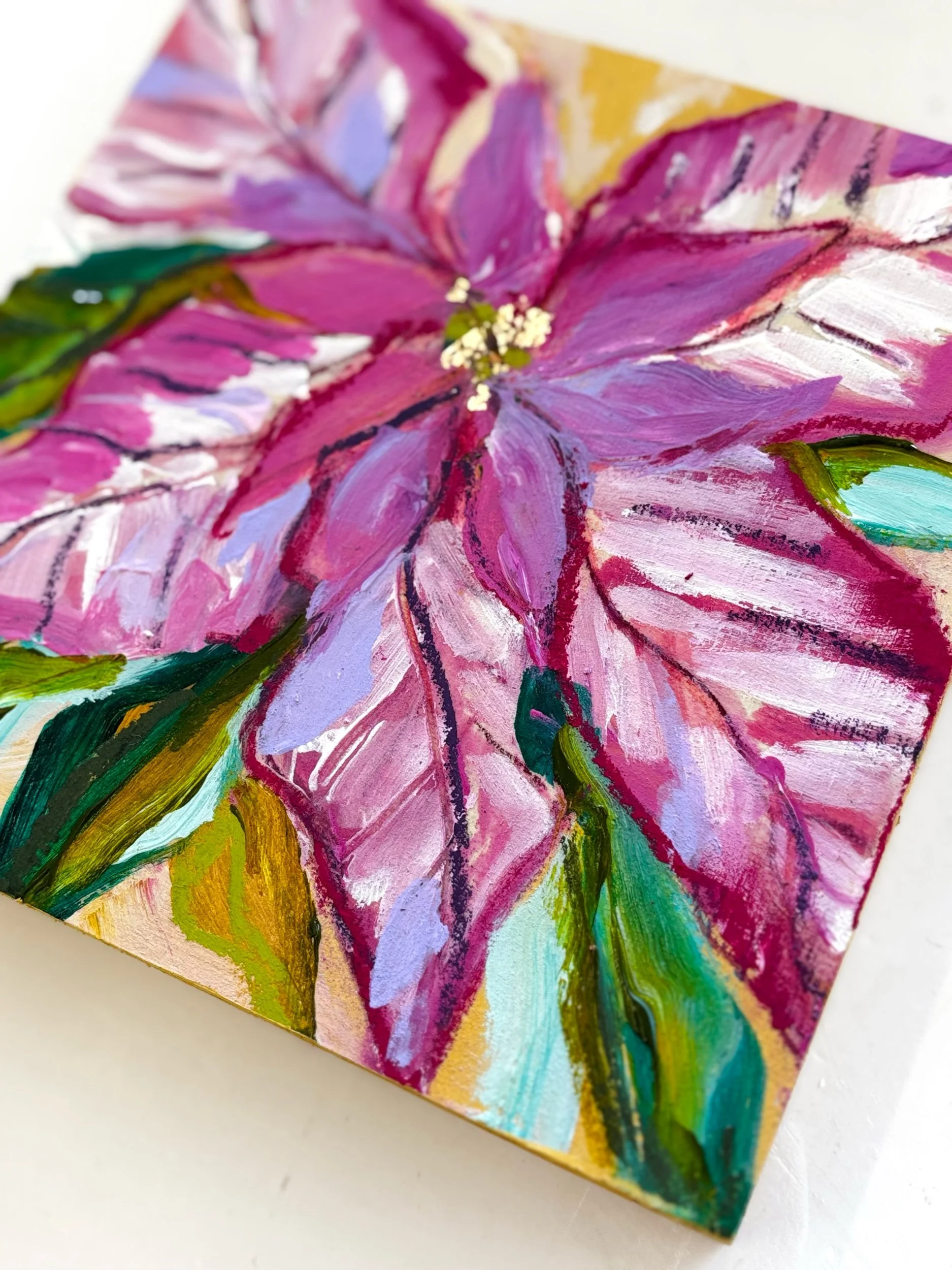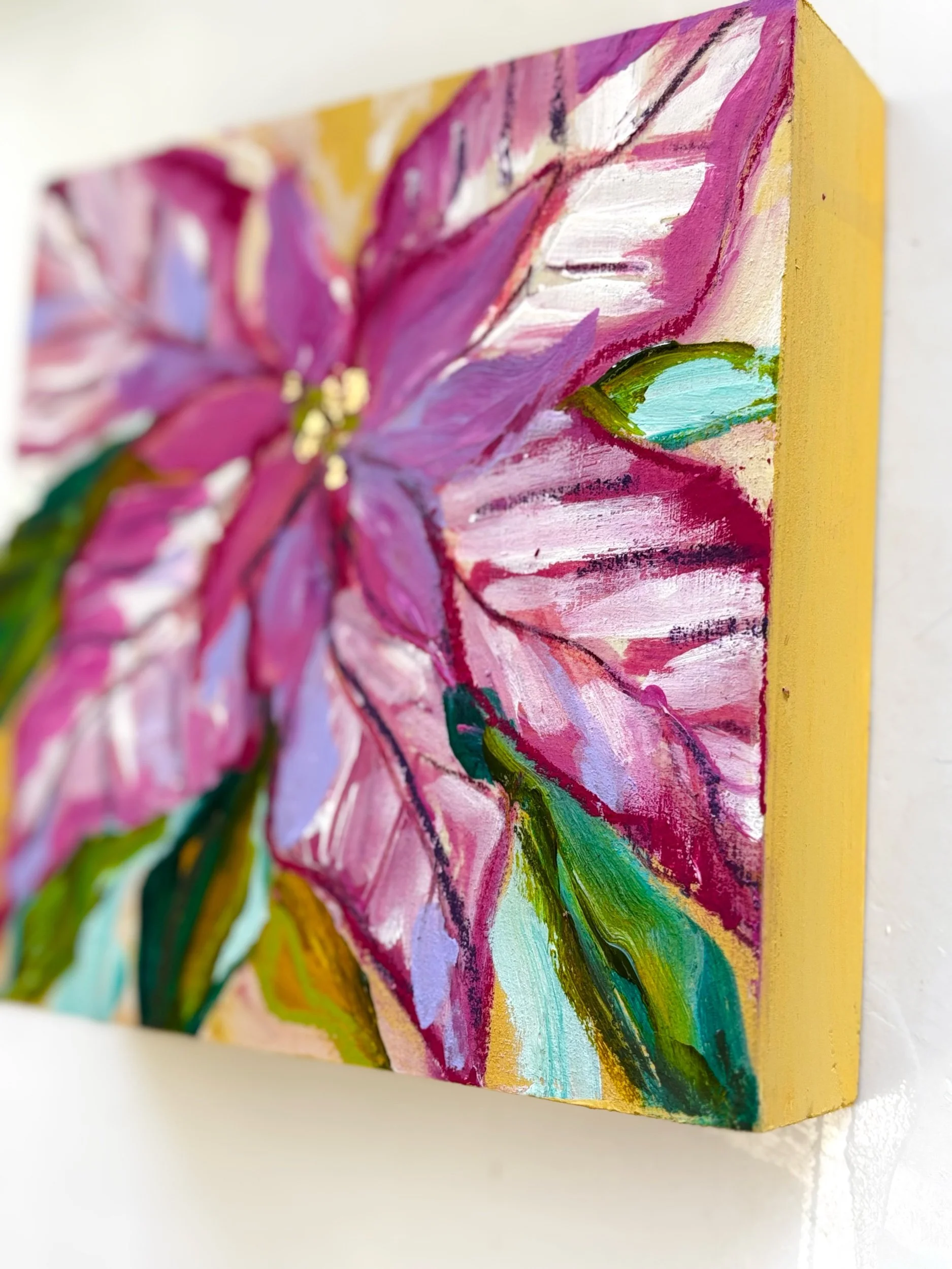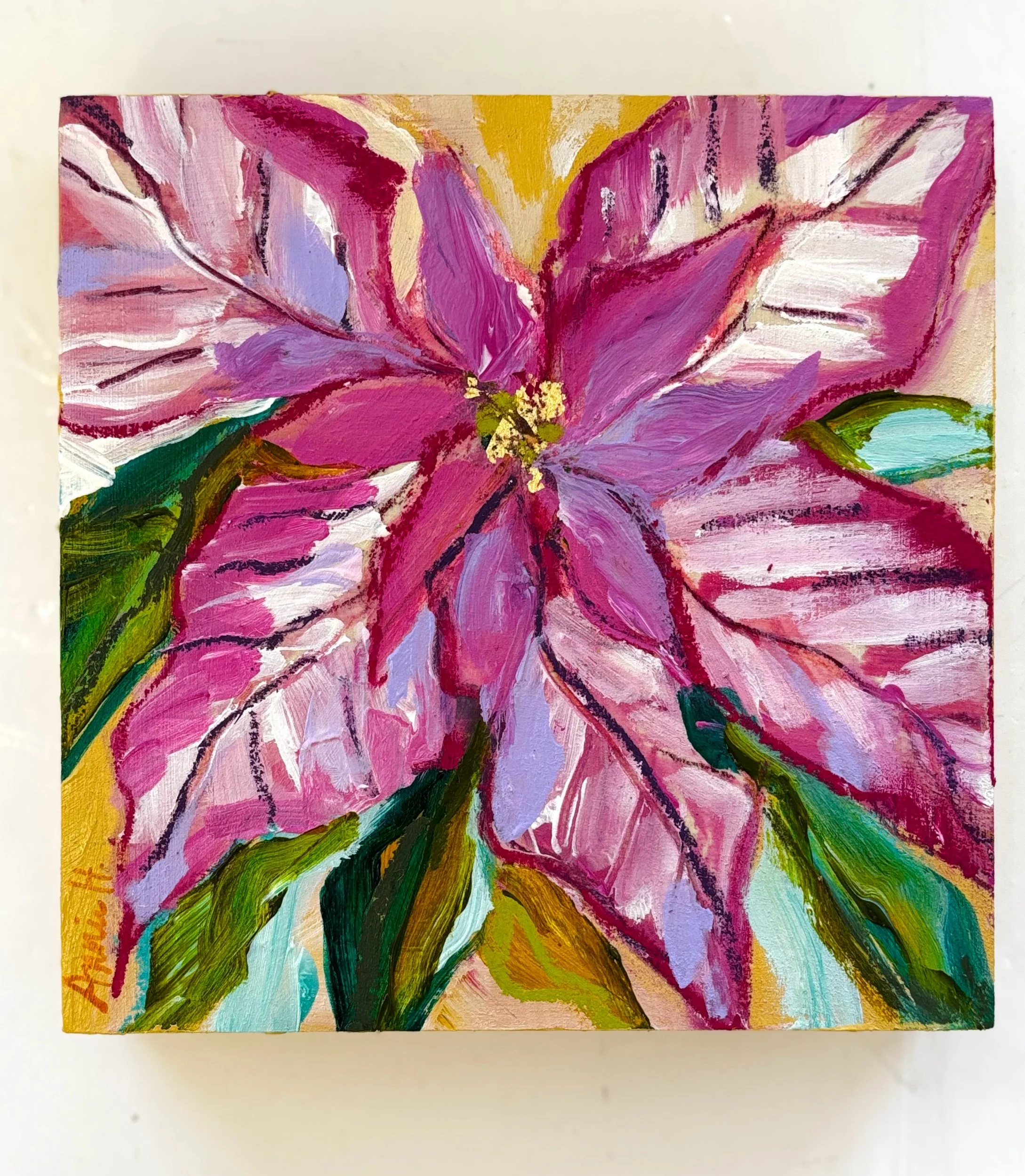 Bright, joyful, and full of painterly texture, this 6x6 poinsettia original brings a fresh, modern twist to a classic Christmas bloom. Painted on a cradled wood panel, this piece shines with layered strokes of magenta, rose pink, lavender, deep greens, and golden undertones. The bold petals and expressive brushwork give the flower movement and life, making it a festive statement in even the smallest space.