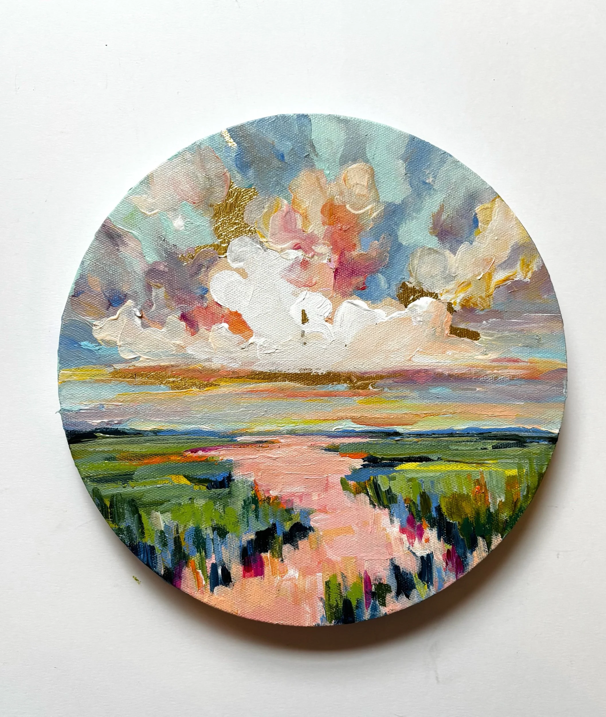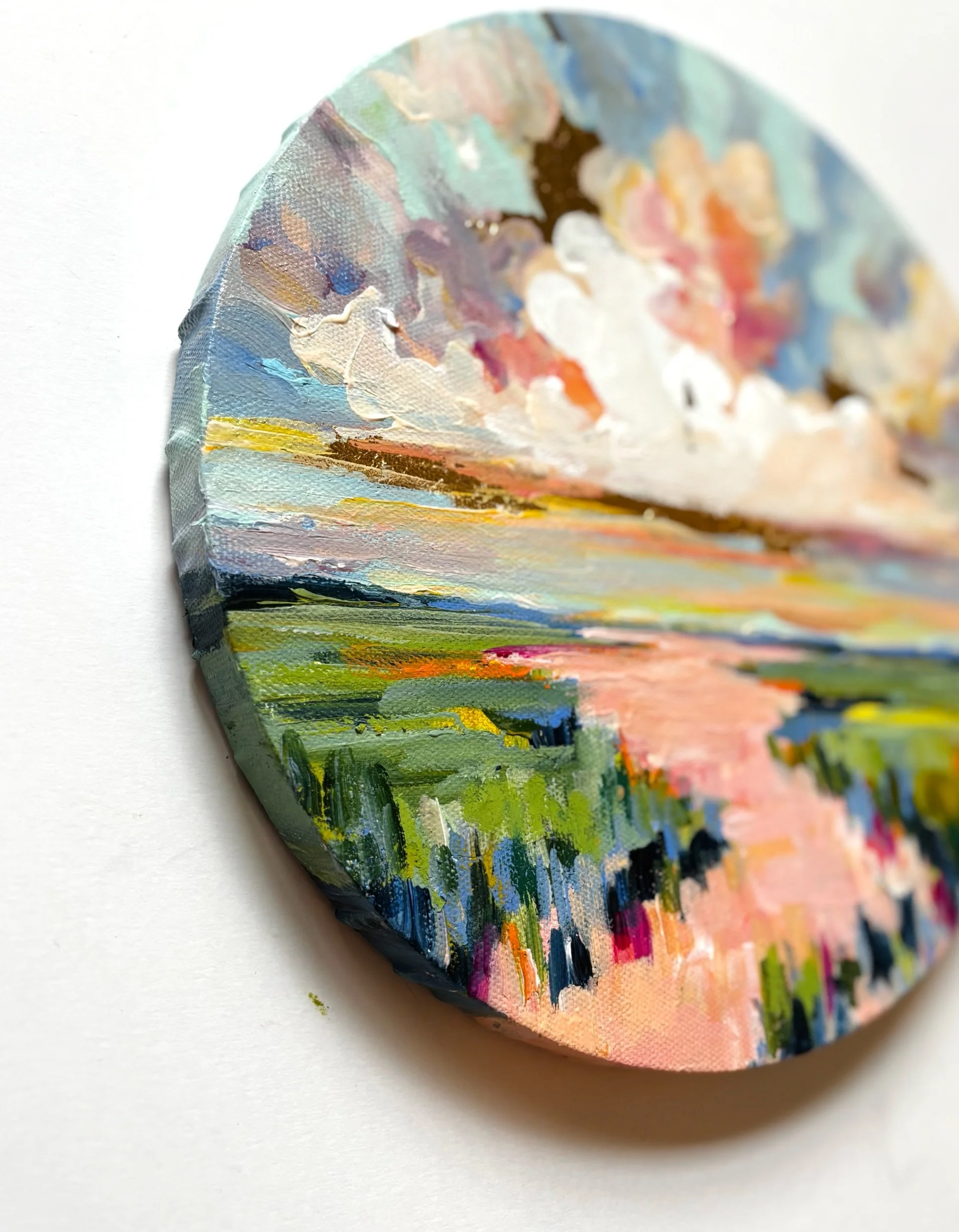 A decor-focused original from the Winter Escapes collection, this 10x10 round canvas is designed to anchor a styled surface with color and softness. Layered acrylic brushstrokes and airy, light-filled tones create an abstract landscape that feels calm, warm, and collected.