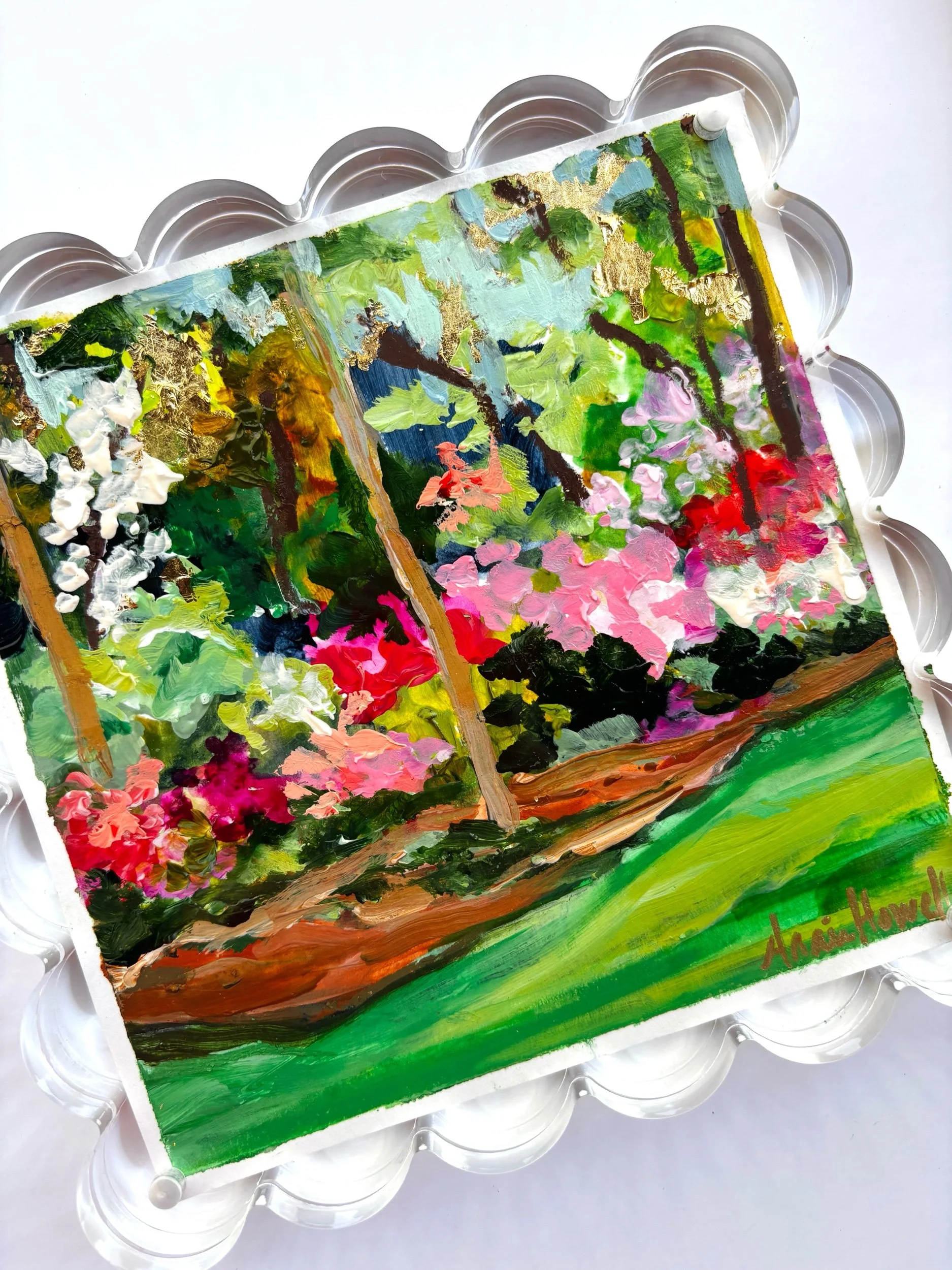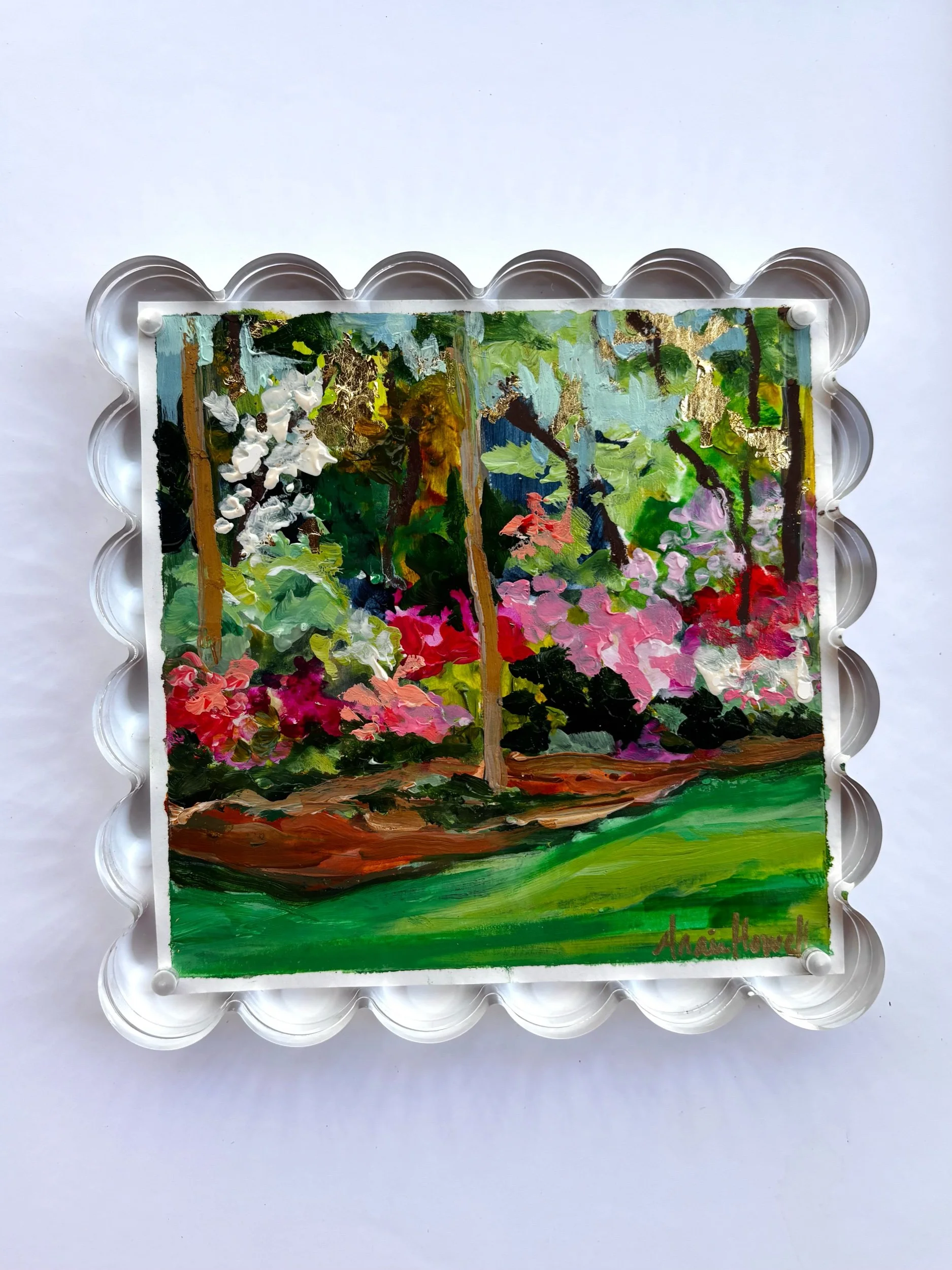 This original azalea garden painting is inspired by the vibrant, layered beauty of Augusta in full bloom—where every turn reveals bursts of pink, red, and white tucked beneath tall southern pines.