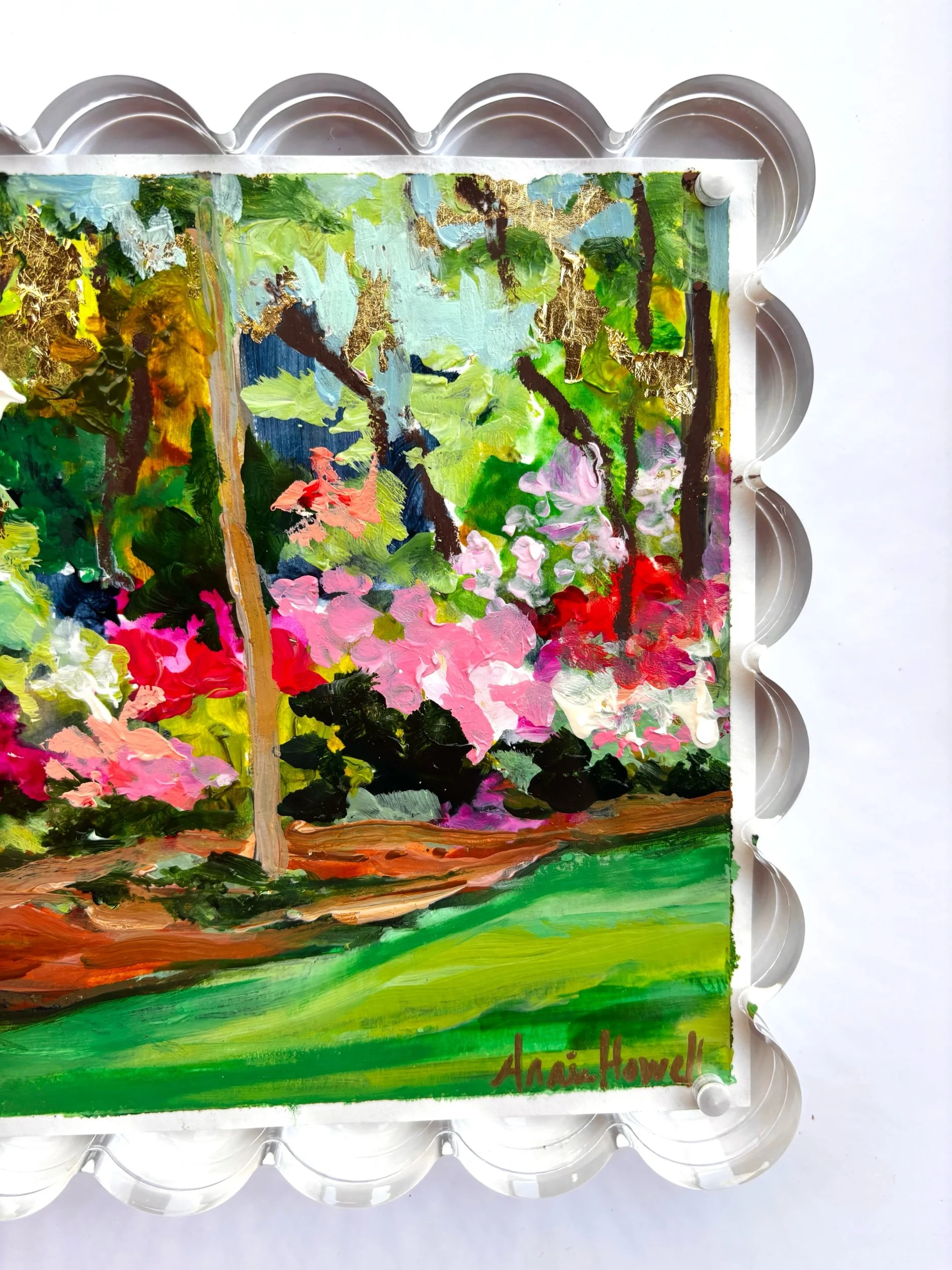 Rich with texture and movement, this piece brings the viewer into the garden itself. Thick, expressive brushstrokes and pops of color create a sense of depth and abundance, while subtle gold leaf accents catch the light—adding a hint of warmth and elegance.