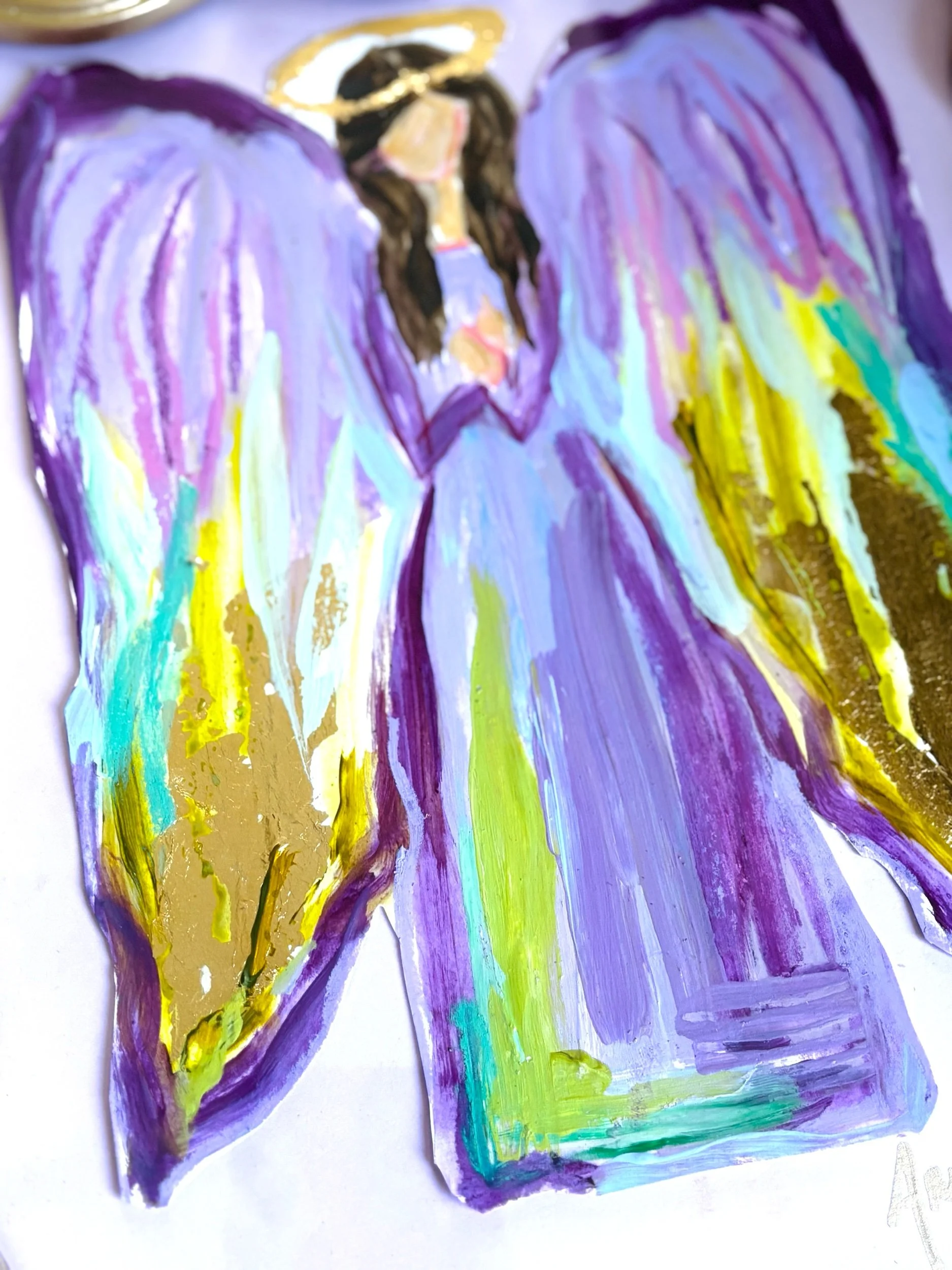 Hand-painted on paper, matted on paper and framed in various 8x10 gold frames—from scalloped to floral—these originals bring warmth, color, and a sense of peace to any home. Whether displayed on a mantel, nestled into a bookshelf, or hanging in an entryway, each angel is designed to shine as a one-of-a-kind artwork.