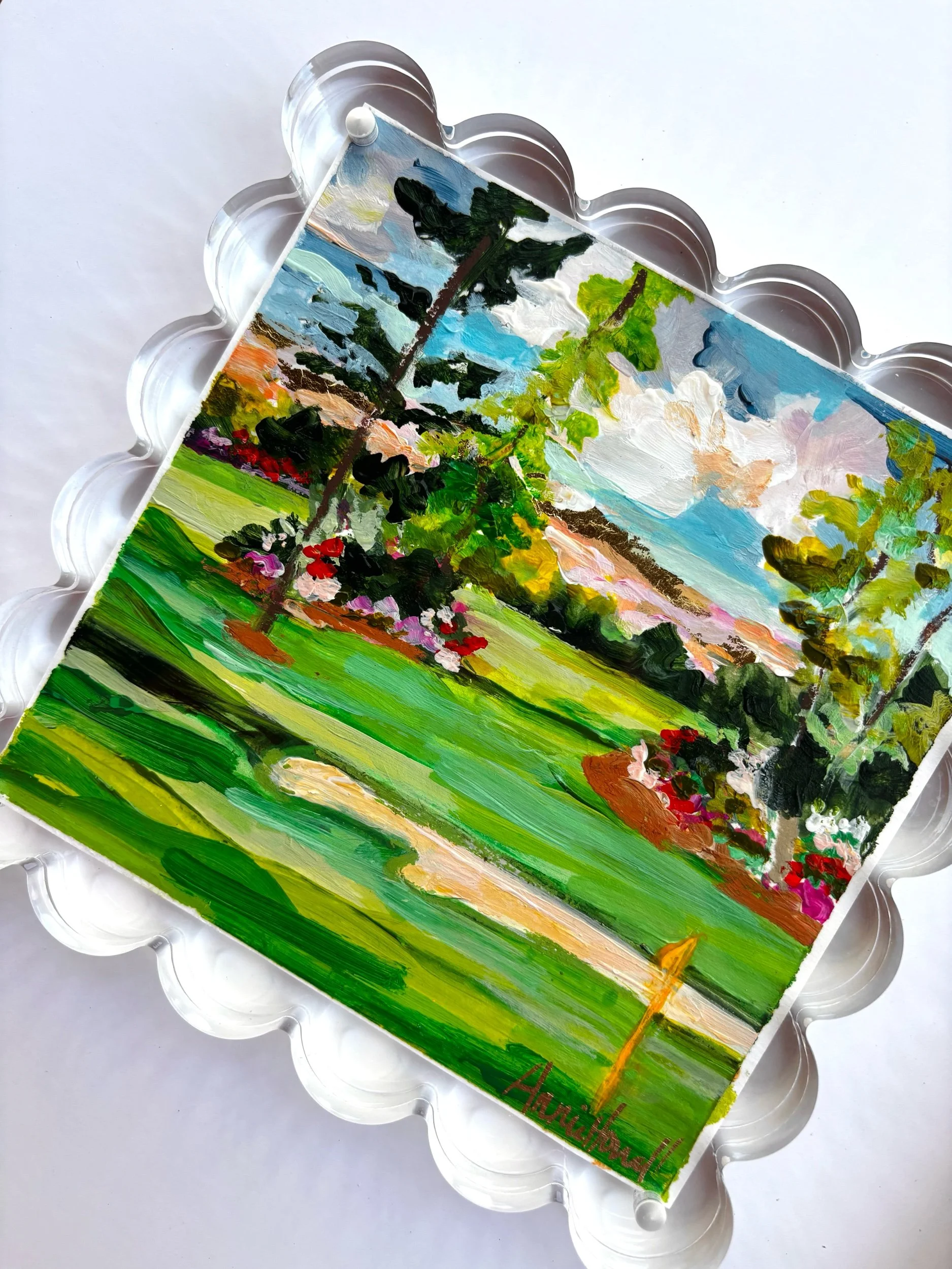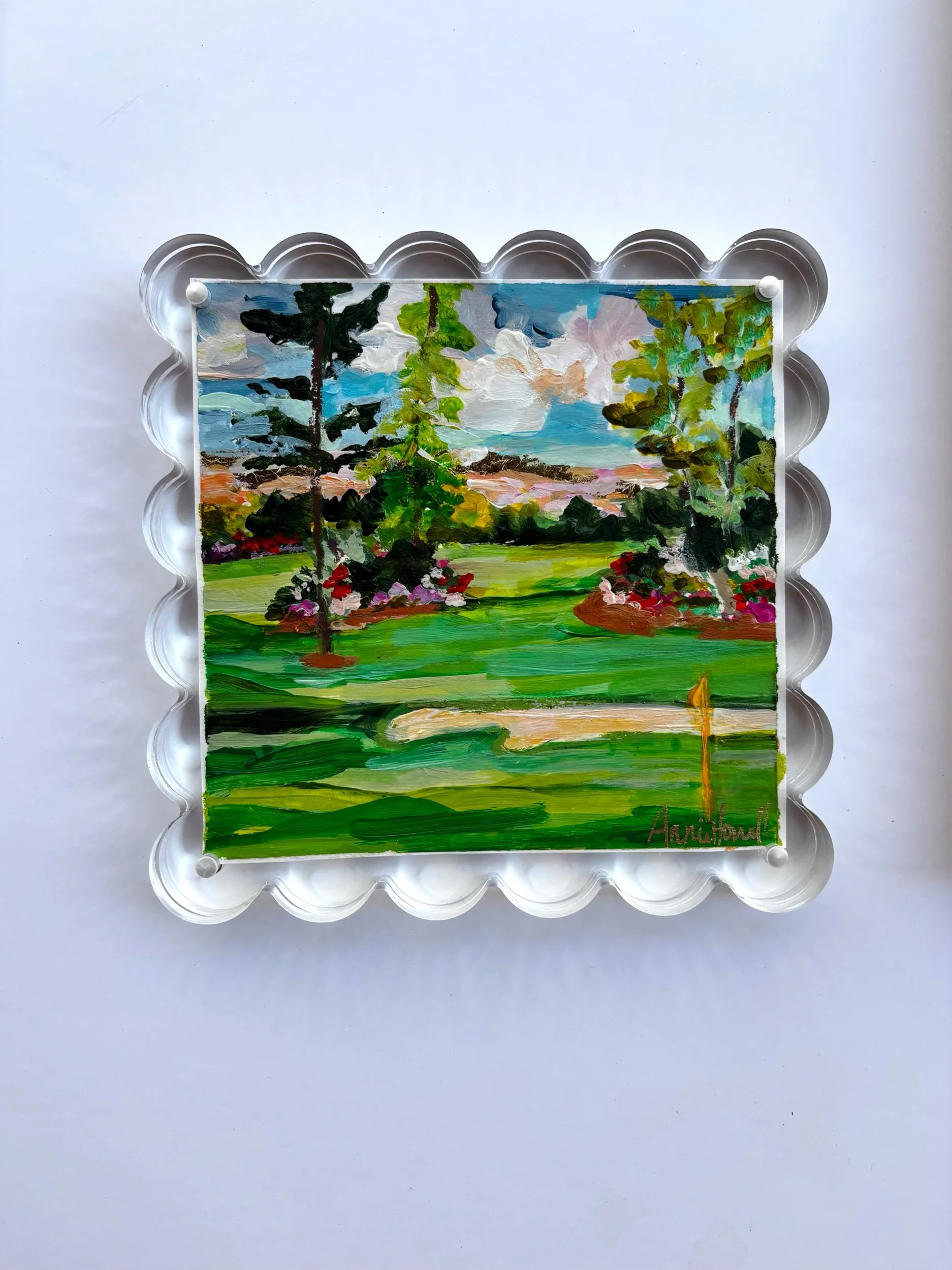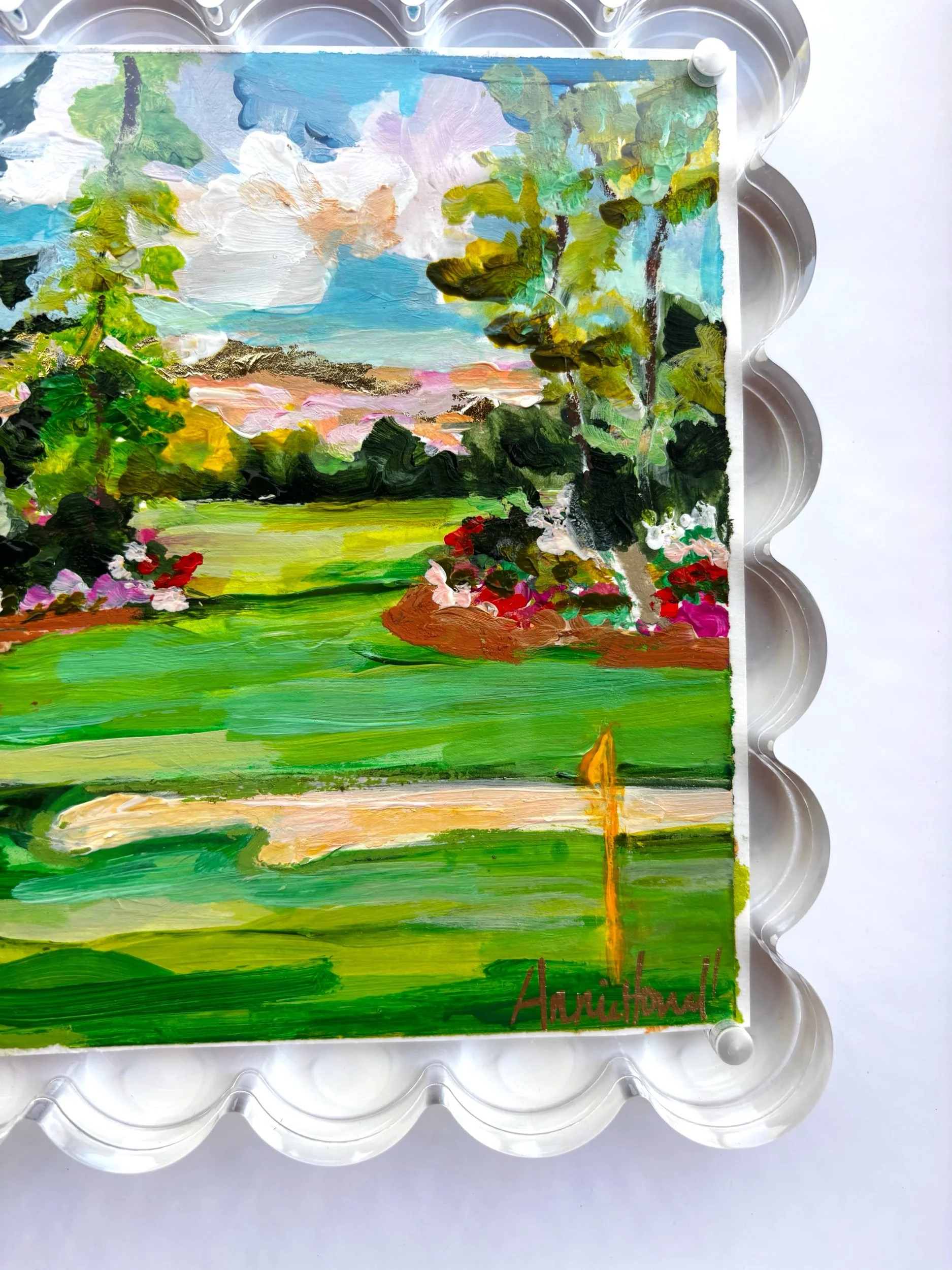 This piece captures that unmistakable moment on the course—lush green fairways stretching forward, soft sand bunkers, and vibrant azaleas in full bloom beneath a glowing southern sky. Painted in expressive, layered brushstrokes, this artwork blends movement, color, and texture to create a fresh, joyful take on a classic golf landscape.