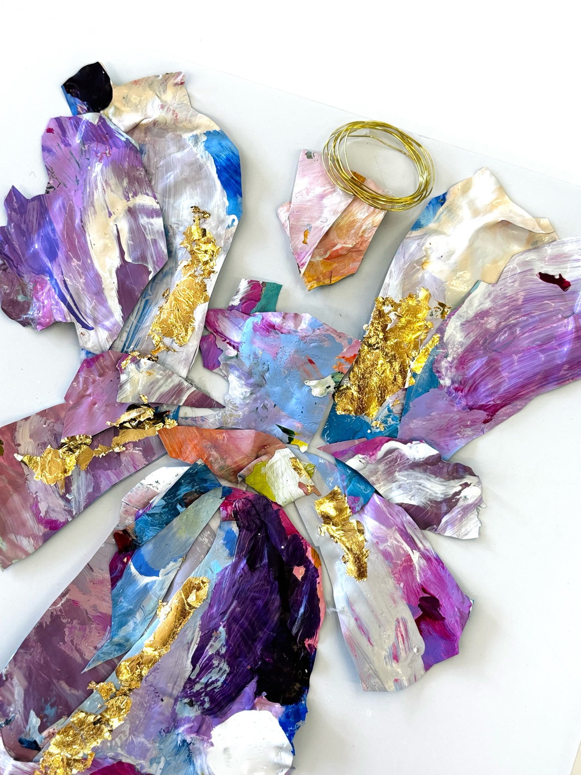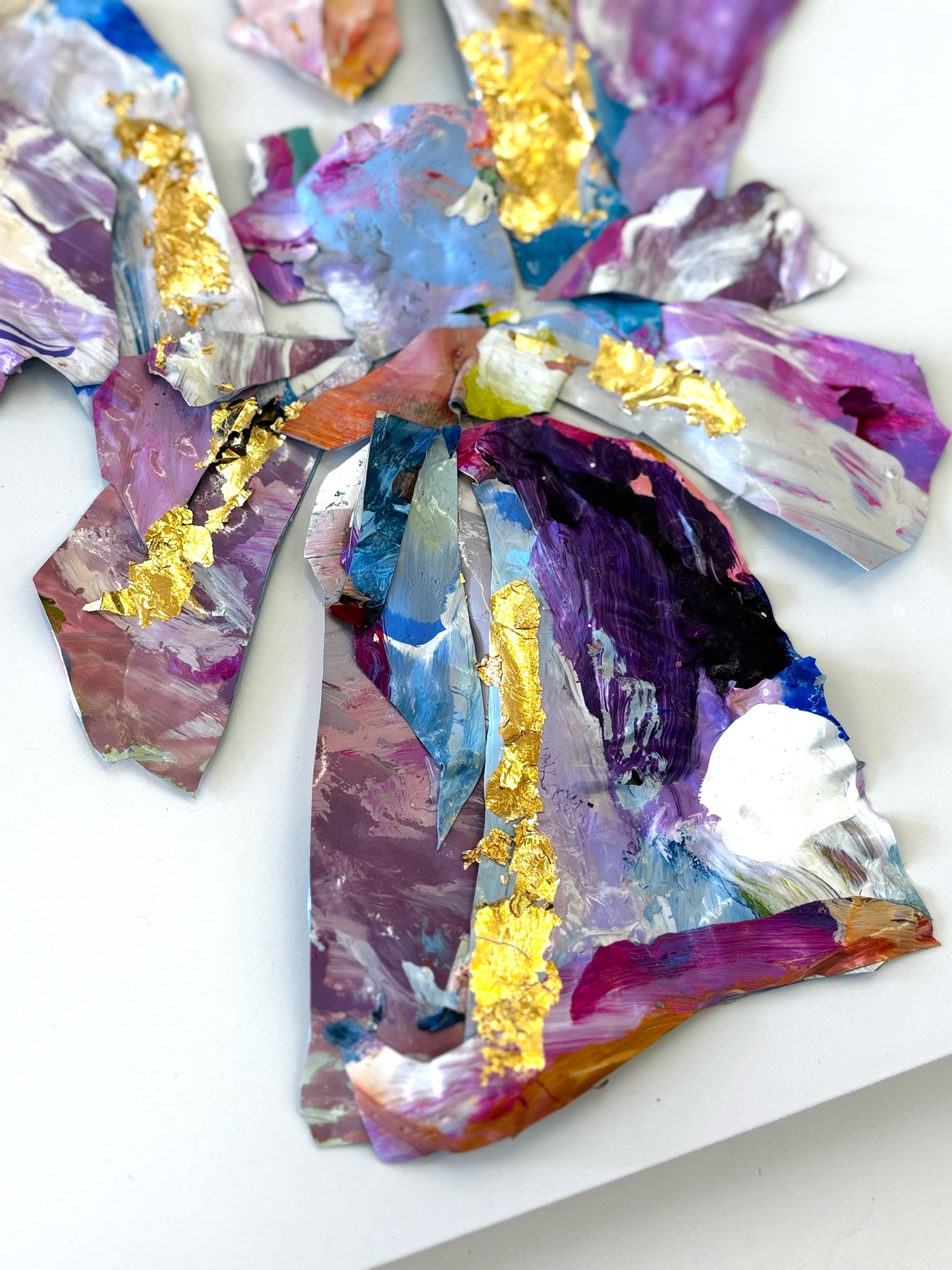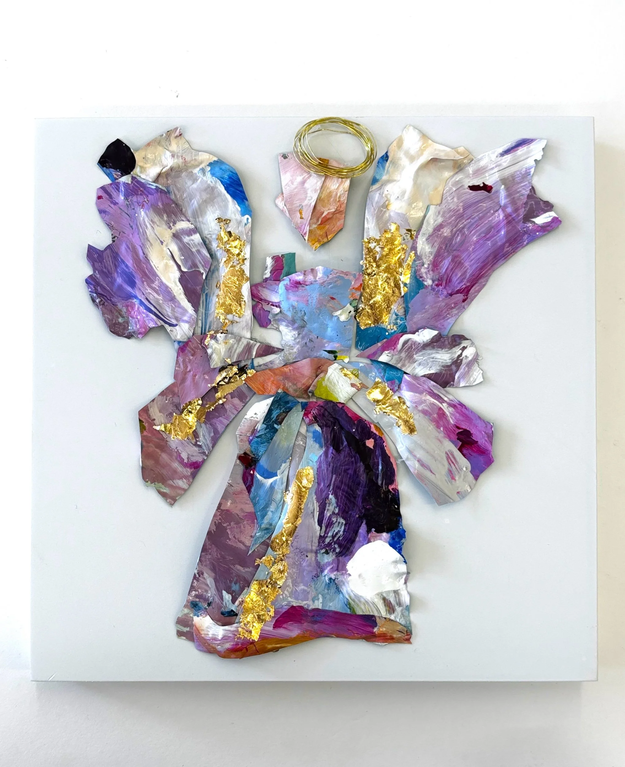 Celebrate the season with this handcrafted Palette Angel, created entirely from real paint palette remnants collected from my studio. Each wing, robe, and detail is hand-cut and arranged to form a dimensional angel bursting with expressive color — soft lavenders, bold violets, creamy whites, ocean blues, and warm sunset tones. Genuine gold leaf accents add a touch of luminous shimmer, while a delicate gold halo completes the piece.