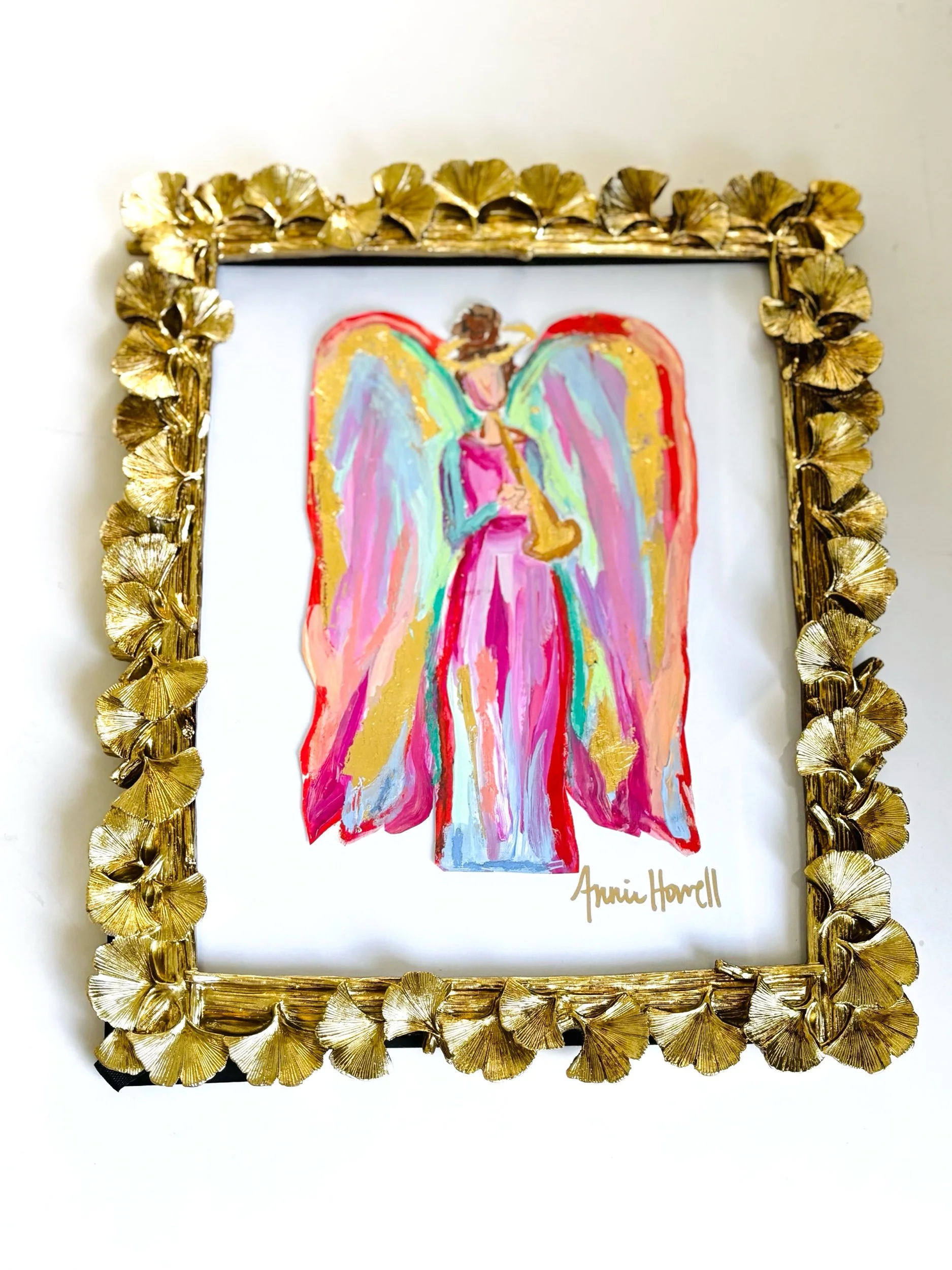Hand-painted on paper, matted on paper and framed in various 8x10 gold frames—from scalloped to floral—these originals bring warmth, color, and a sense of peace to any home. Whether displayed on a mantel, nestled into a bookshelf, or hanging in an entryway, each angel is designed to shine as a one-of-a-kind artwork.