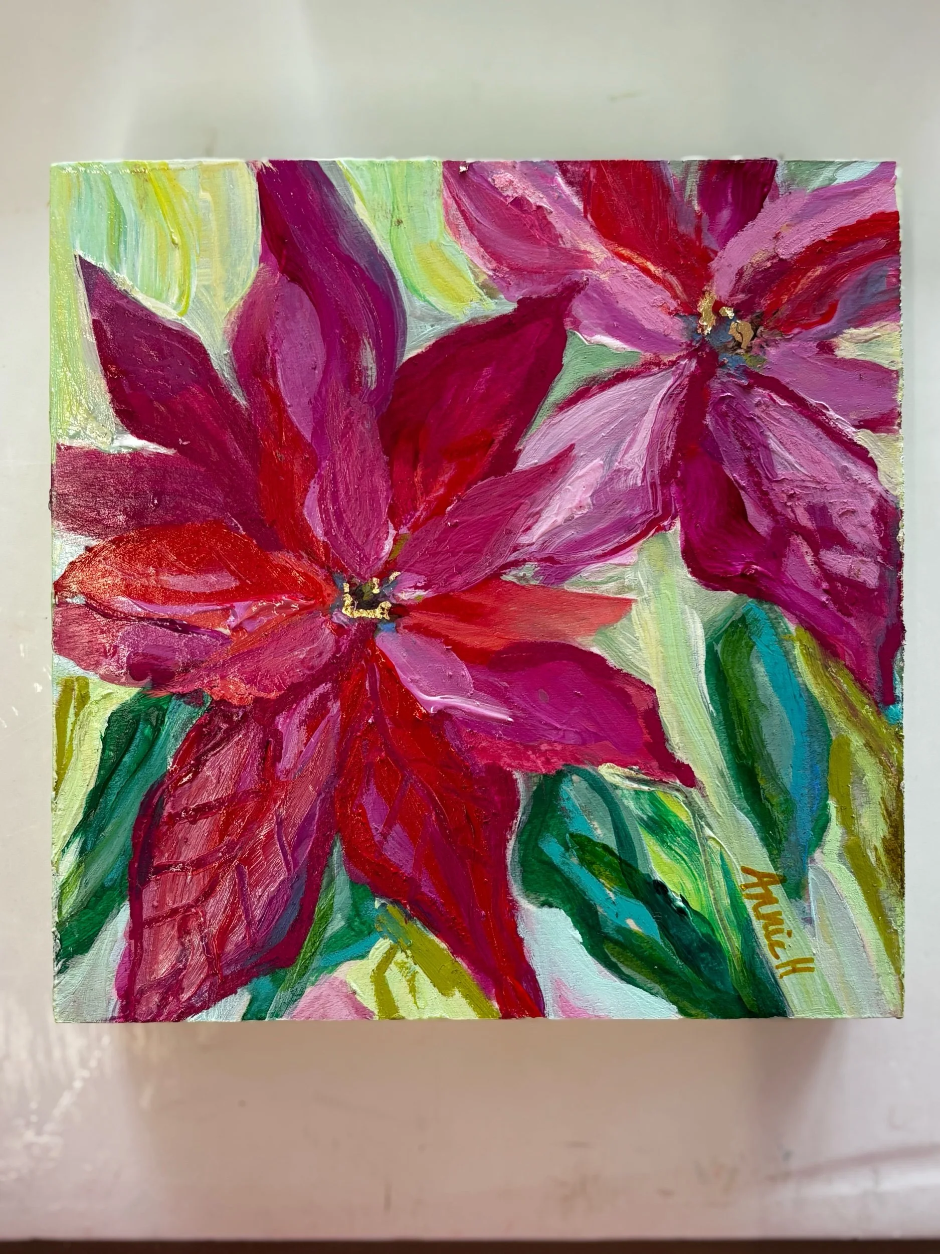 Painted on a cradled wood panel, this piece layers beautifully with other holiday florals or stands alone as a vibrant Christmas statement.