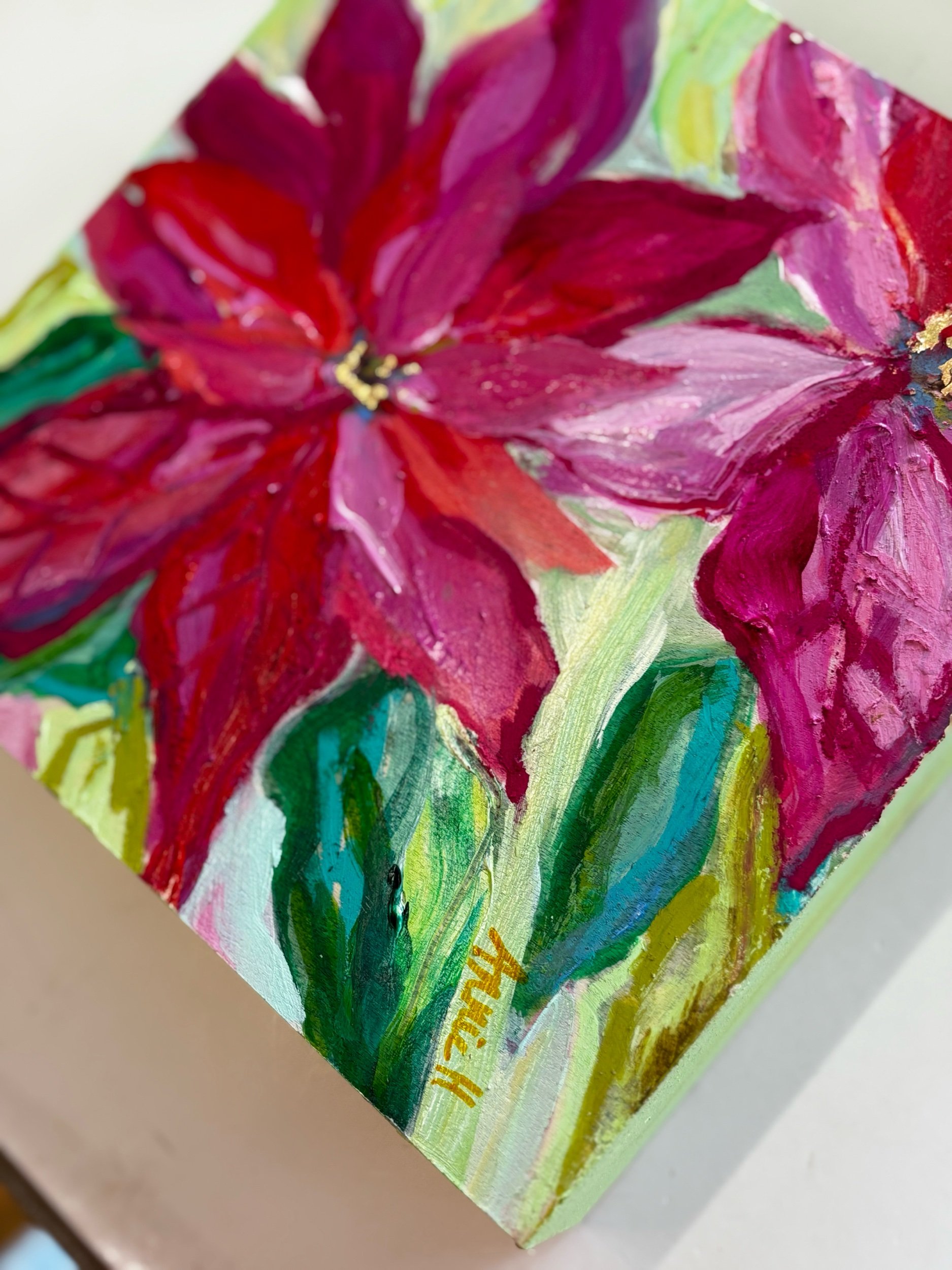 Bright, dynamic, and full of painterly energy, this 6x6 poinsettia duo blends rich magentas, berry reds, soft pinks, and lush greens for a joyful, colorful holiday floral. Expressive brushwork gives the petals movement, while hints of gold in the center add festive warmth. A soft background in greens and yellows brings a fresh, lively glow.