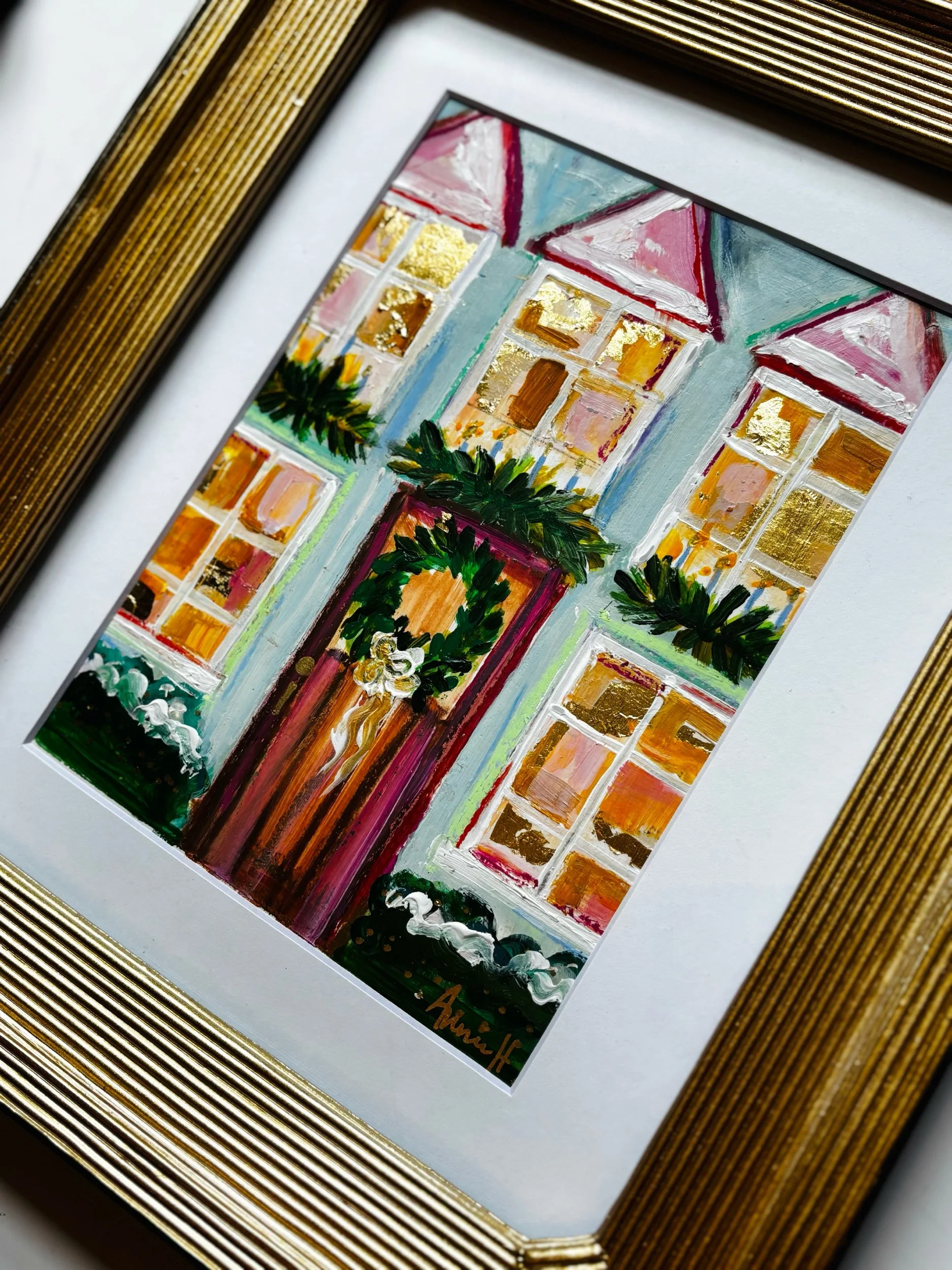 This pastel holiday townhouse glows with golden windows, lush greenery, and a classic wreath tied with a soft gold bow. The charming pink rooflines and snowy hedges add a whimsical touch, making this painting feel cozy, bright, and full of Christmas magic. A perfect piece for collectors who love cheerful colors and nostalgic holiday homes