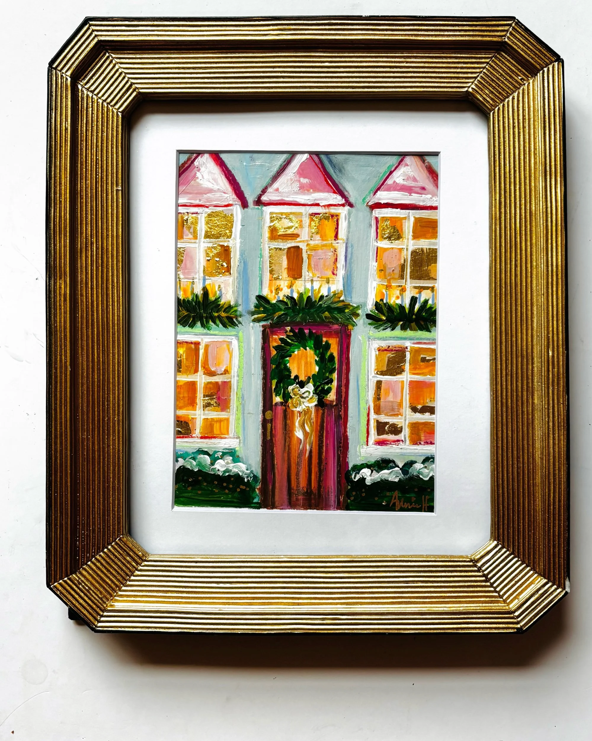 Home for the Holidays — Original Christmas Door Collection. Each piece features a 6x8 original on paper framed in an 8x10 gold frame.