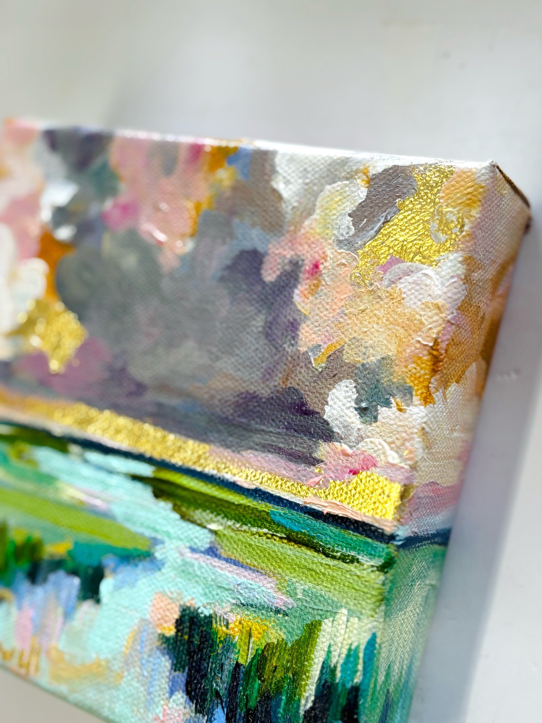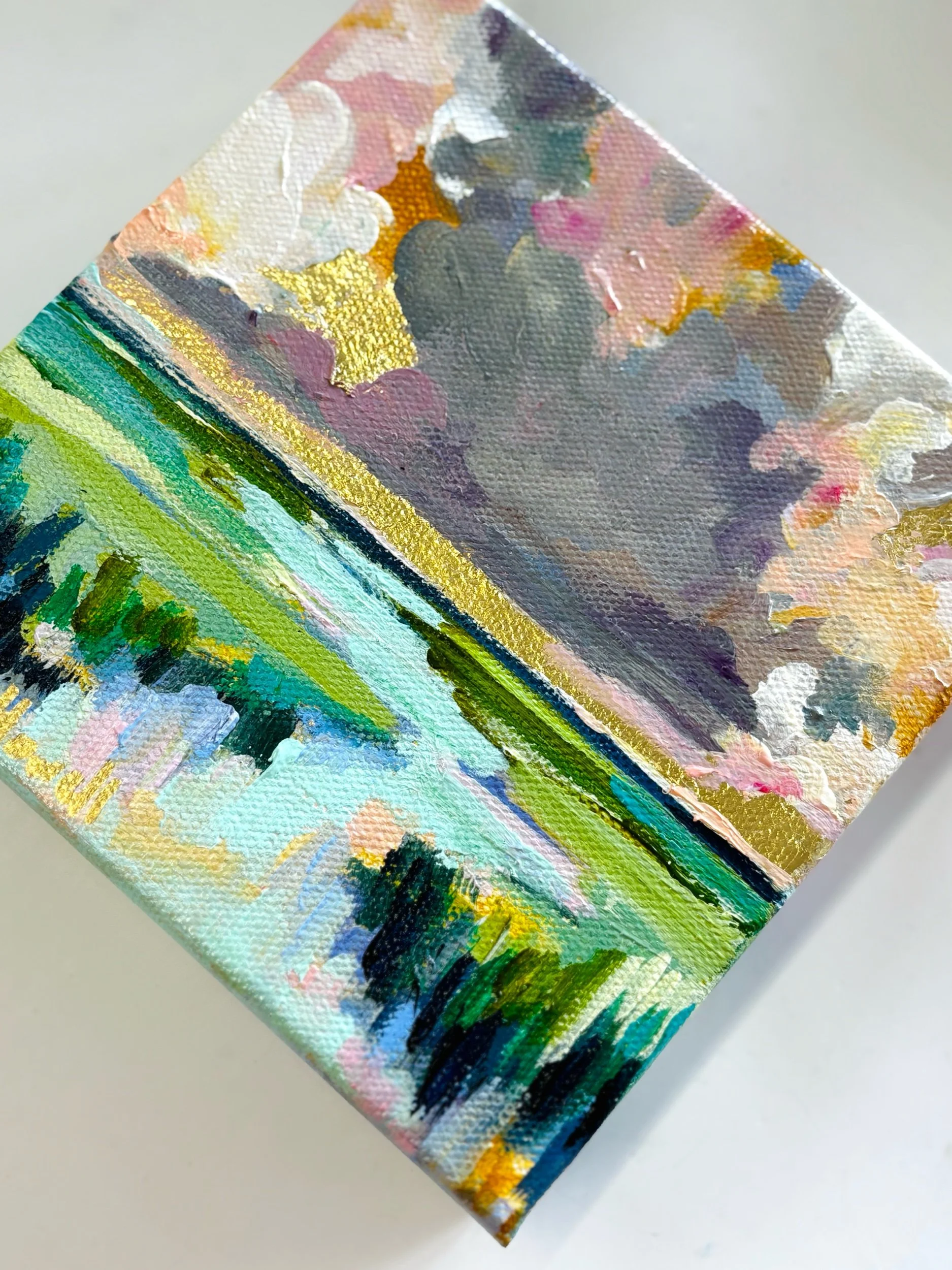 Grounded in calm blues and greens with a dramatic sky full of movement, this 6x6 original marsh painting captures the energy of a Lowcountry storm rolling in. Soft pastels meet moody grays, while touches of gold leaf illuminate the horizon—bringing depth, contrast, and quiet magic to this compact landscape.