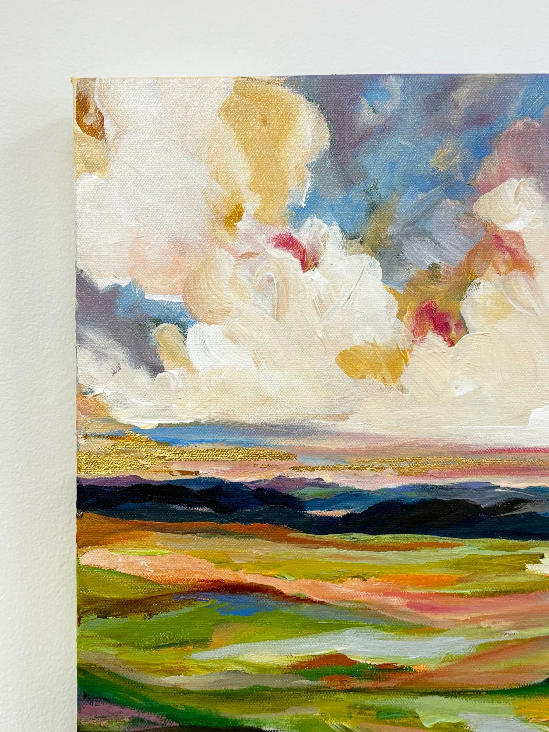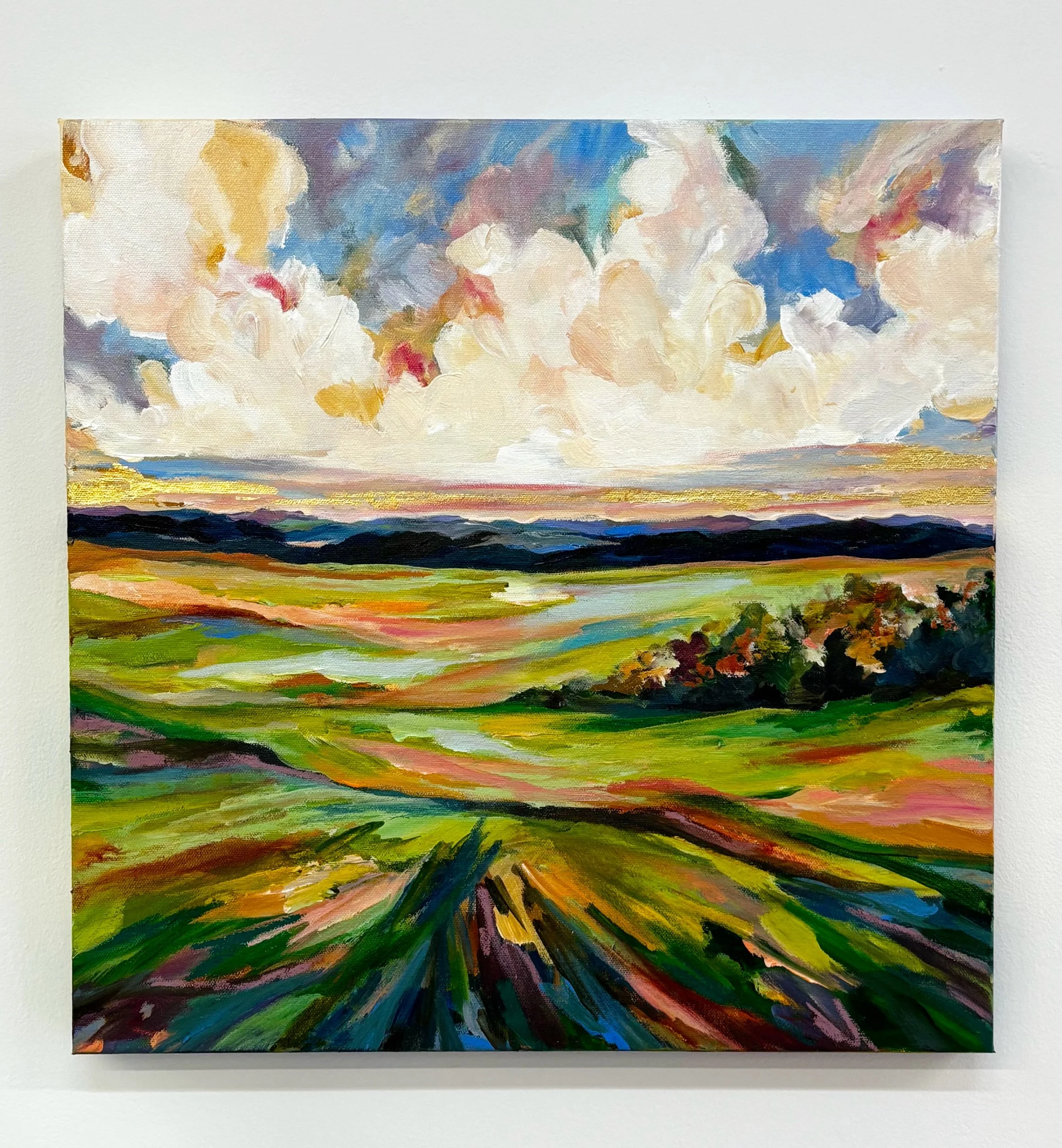 October Fields” is a 20x20 original mixed-media landscape inspired by the rich, painterly hues of early autumn—where warm sunset light touches rolling fields, distant tree lines glow, and the sky unfolds in soft clouds and shifting color.