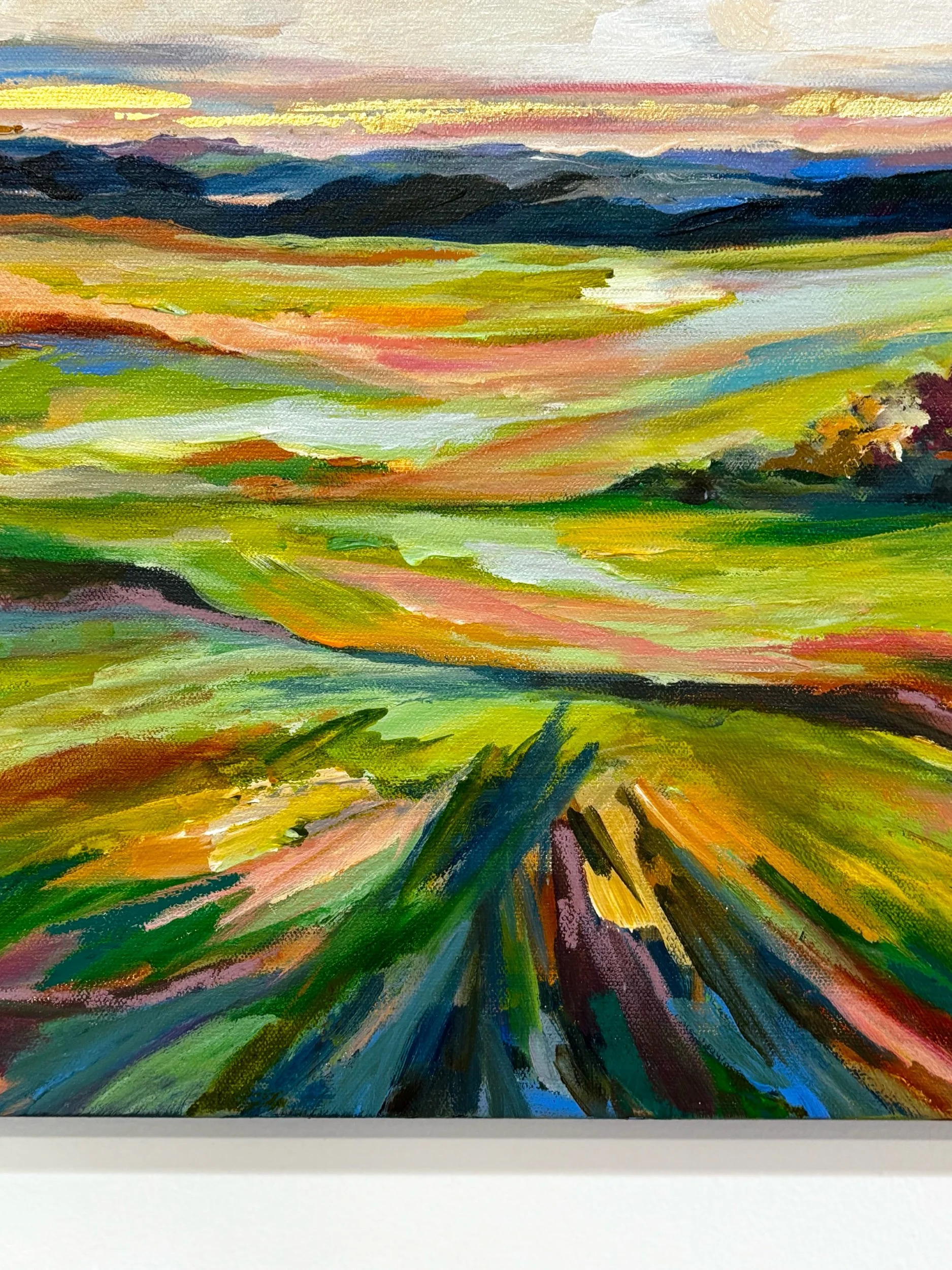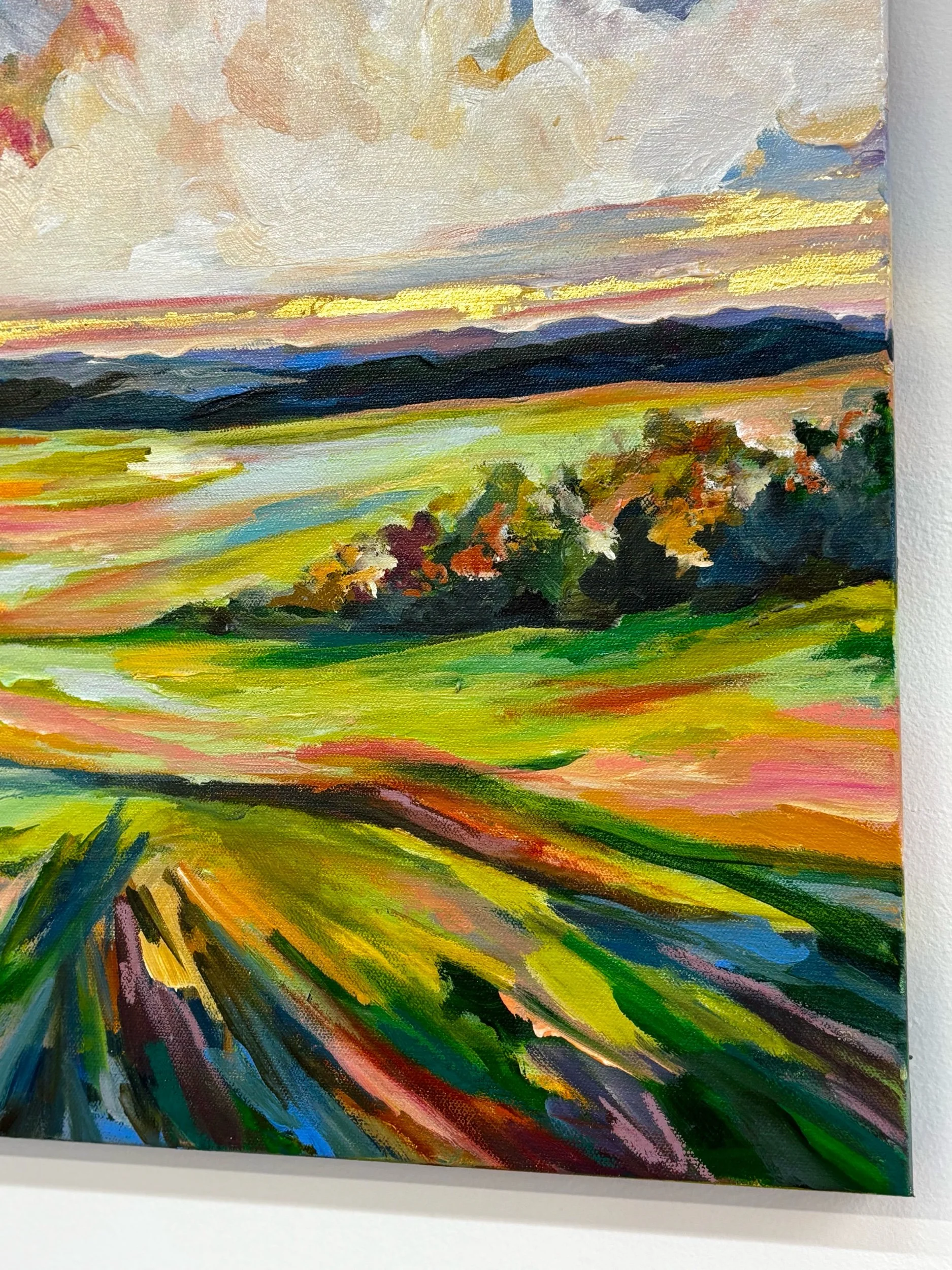 This piece features bold brushwork, layered texture, and shimmering gold-leaf accents, blending deep greens, ochres, warm corals, and vibrant sky tones that create a sweeping sense of movement. The perspective pulls you forward, as if walking through the fields yourself—feeling the cool air, the open sky, and that unmistakable October glow.