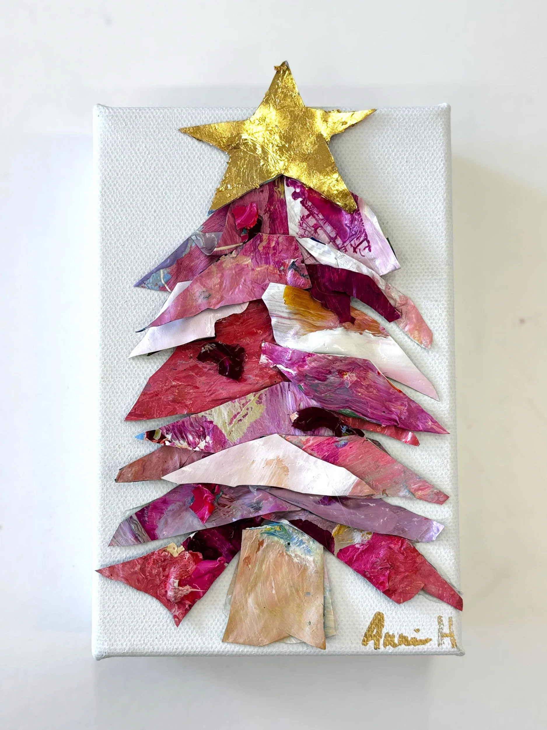 his Pink Palette Christmas Tree shines with vibrant magentas, blush tones, rose reds, and creamy whites — all cut from real paint palettes used in my studio. Each layer is hand-shaped to create a modern, sculptural tree full of movement and texture. Finished with a glowing gold-leaf star, it brings a playful yet elegant pop of color to your holiday décor.