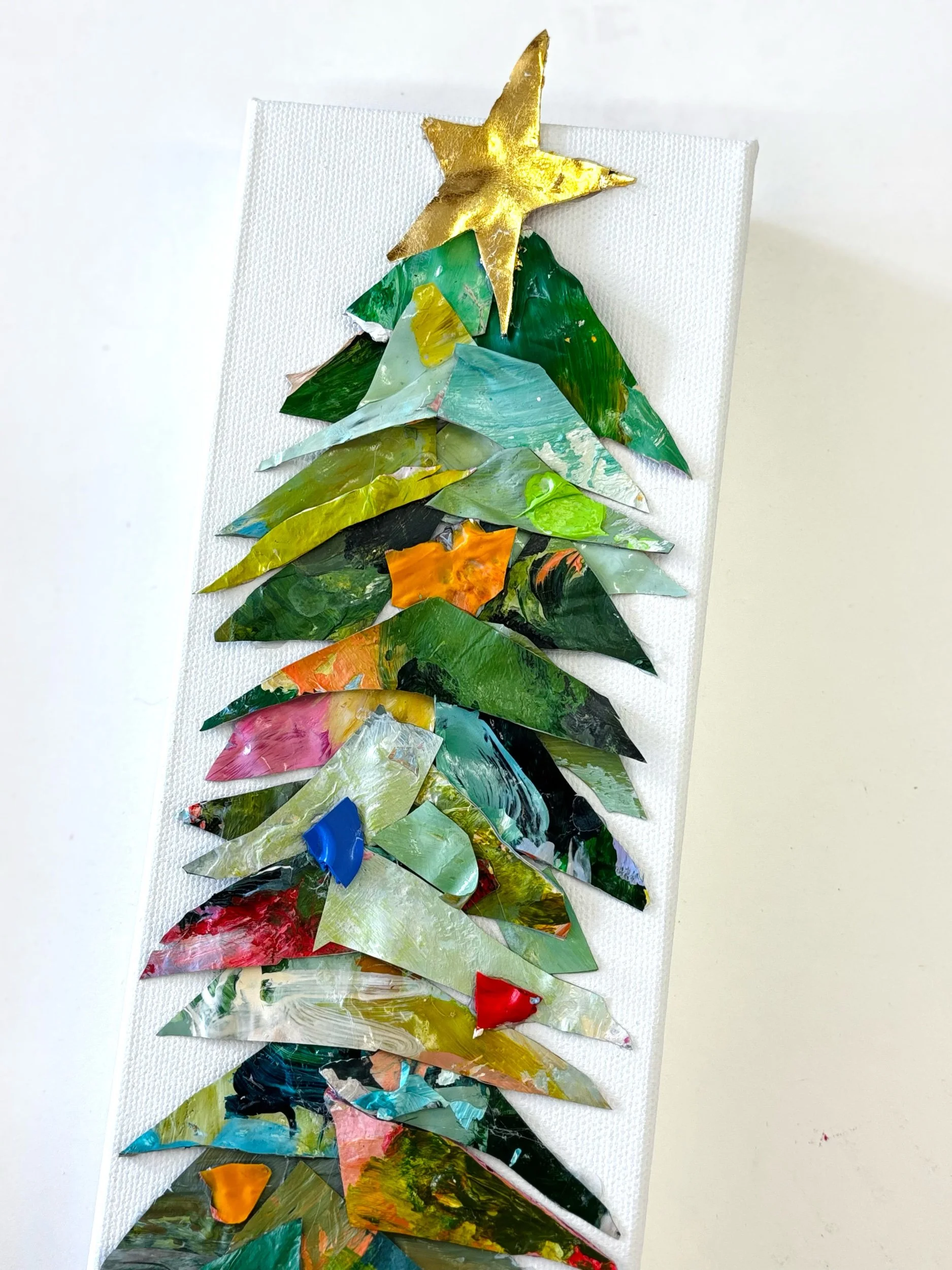 Celebrate the season with a one-of-a-kind Palette Christmas Tree, handcrafted from real paint palette remnants collected from my studio. Each sculptural tree features layered, hand-cut acrylic palette pieces, dimensional texture, and a signature gold-leaf star that catches the light beautifully.