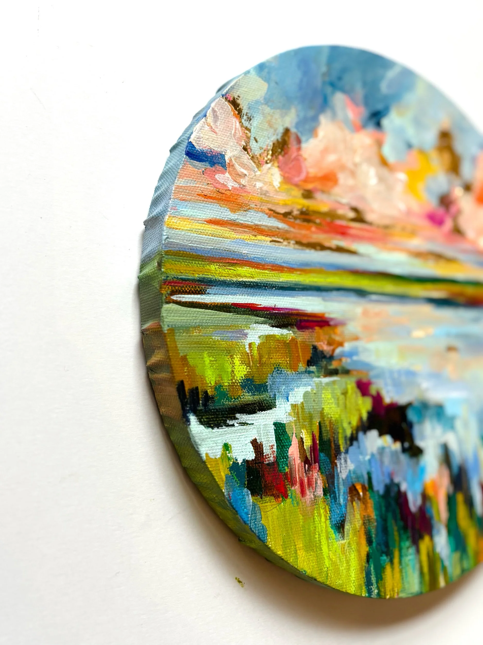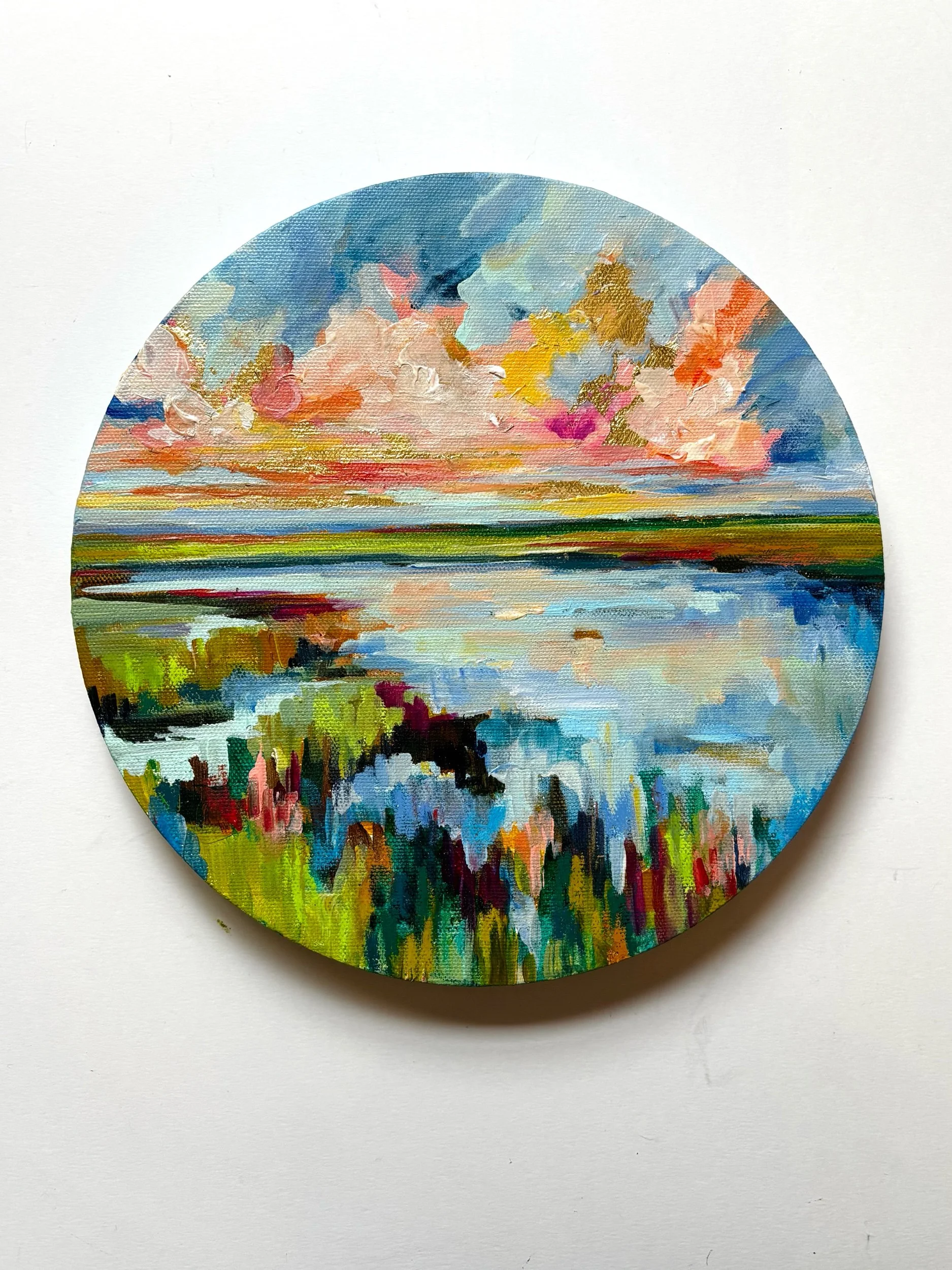 This original 10x10 coffee table canvas features a vibrant marshland scene filled with layered color, soft clouds, and painterly reflections. Lush greens, airy blues, and warm sunset hues come together in a joyful, modern landscape designed to bring light and movement into your home.