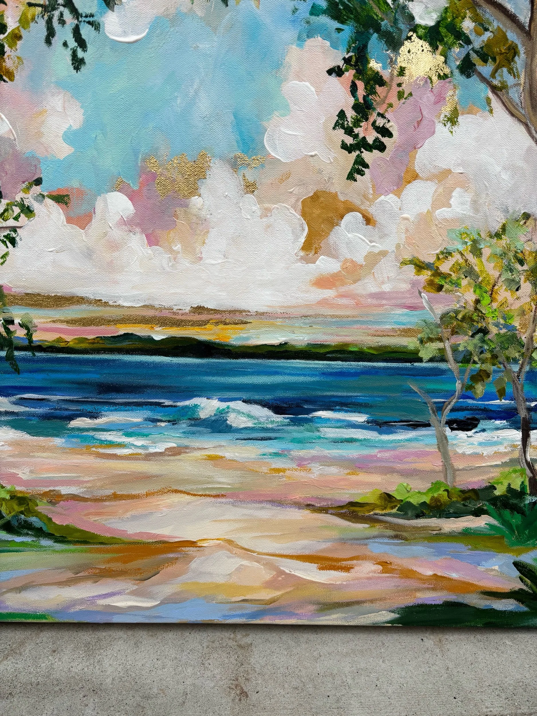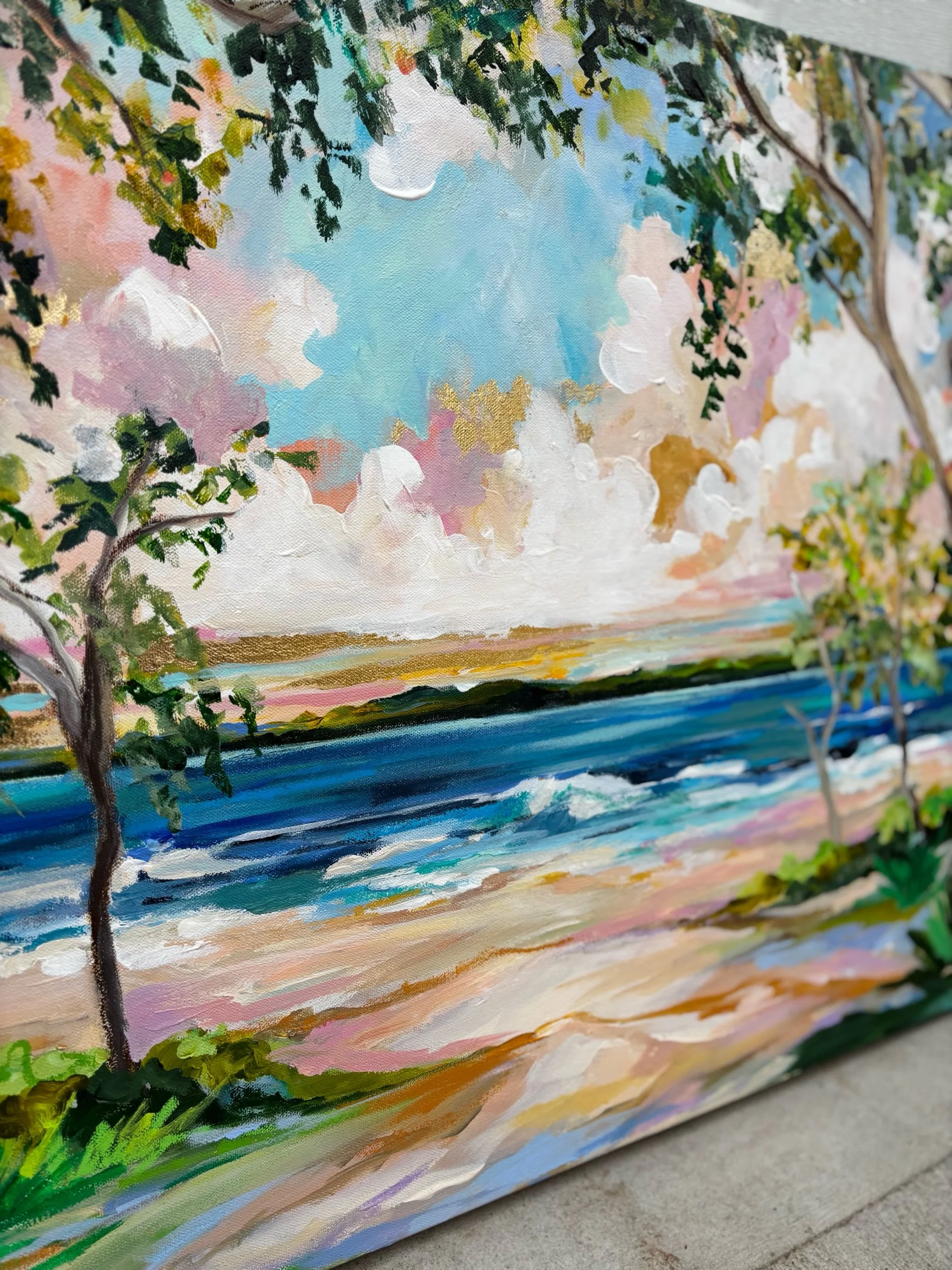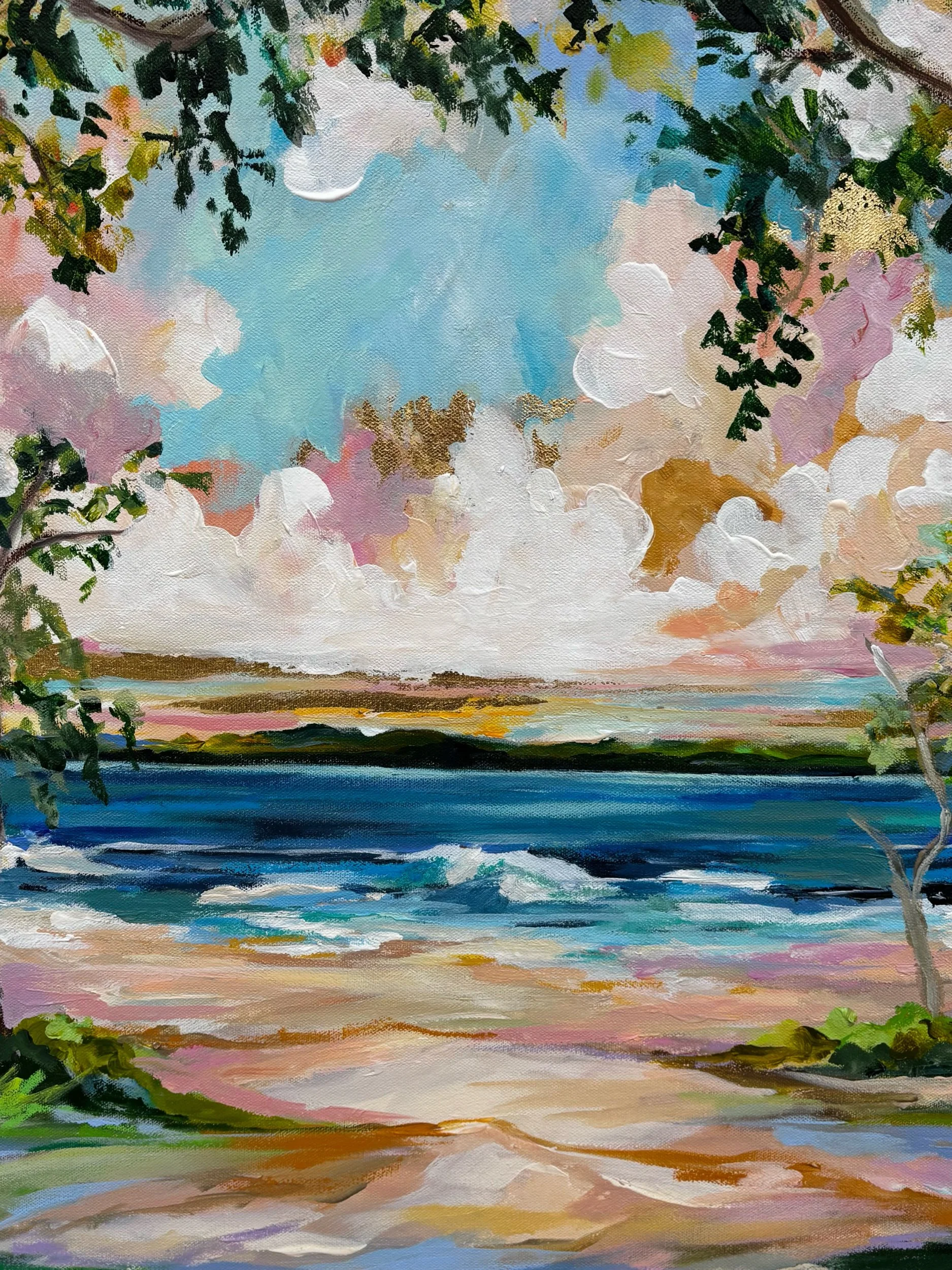 Bring the calm, color, and movement of the coast into your home with Coastal Canopy, a vibrant coastal landscape print inspired by sunlit shorelines and the gentle rhythm of the sea. Framed by sweeping trees and dappled light, this piece captures that quiet, in-between moment—where the breeze moves through the leaves and the water meets the sand in soft, rolling waves.