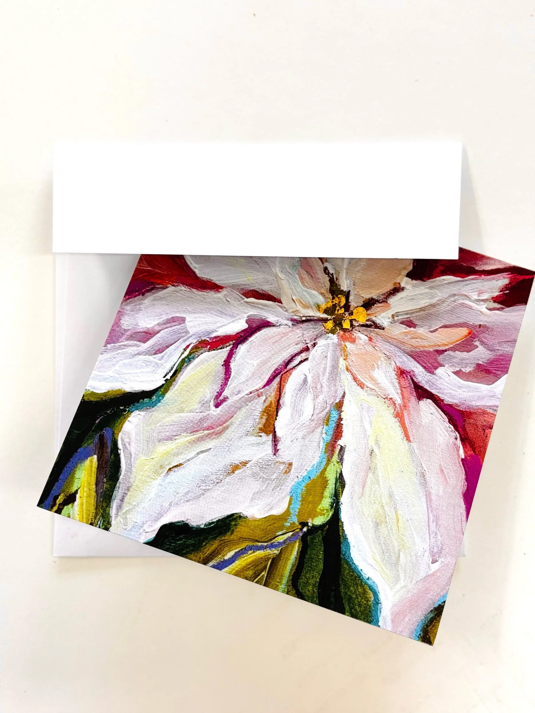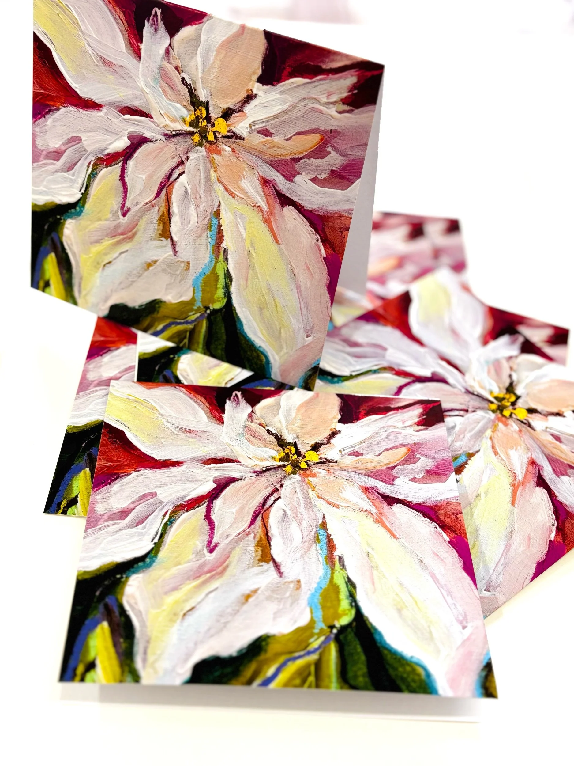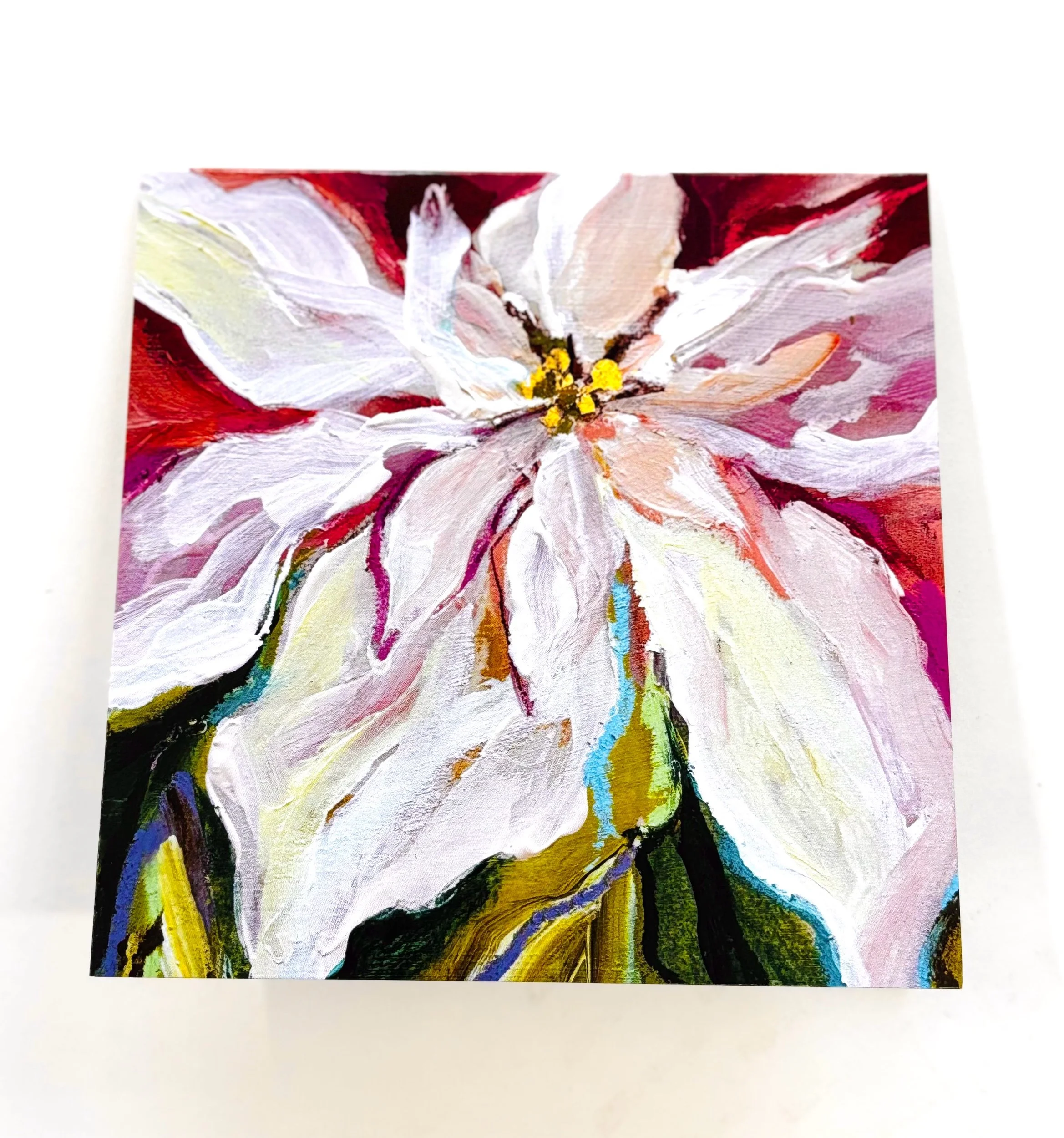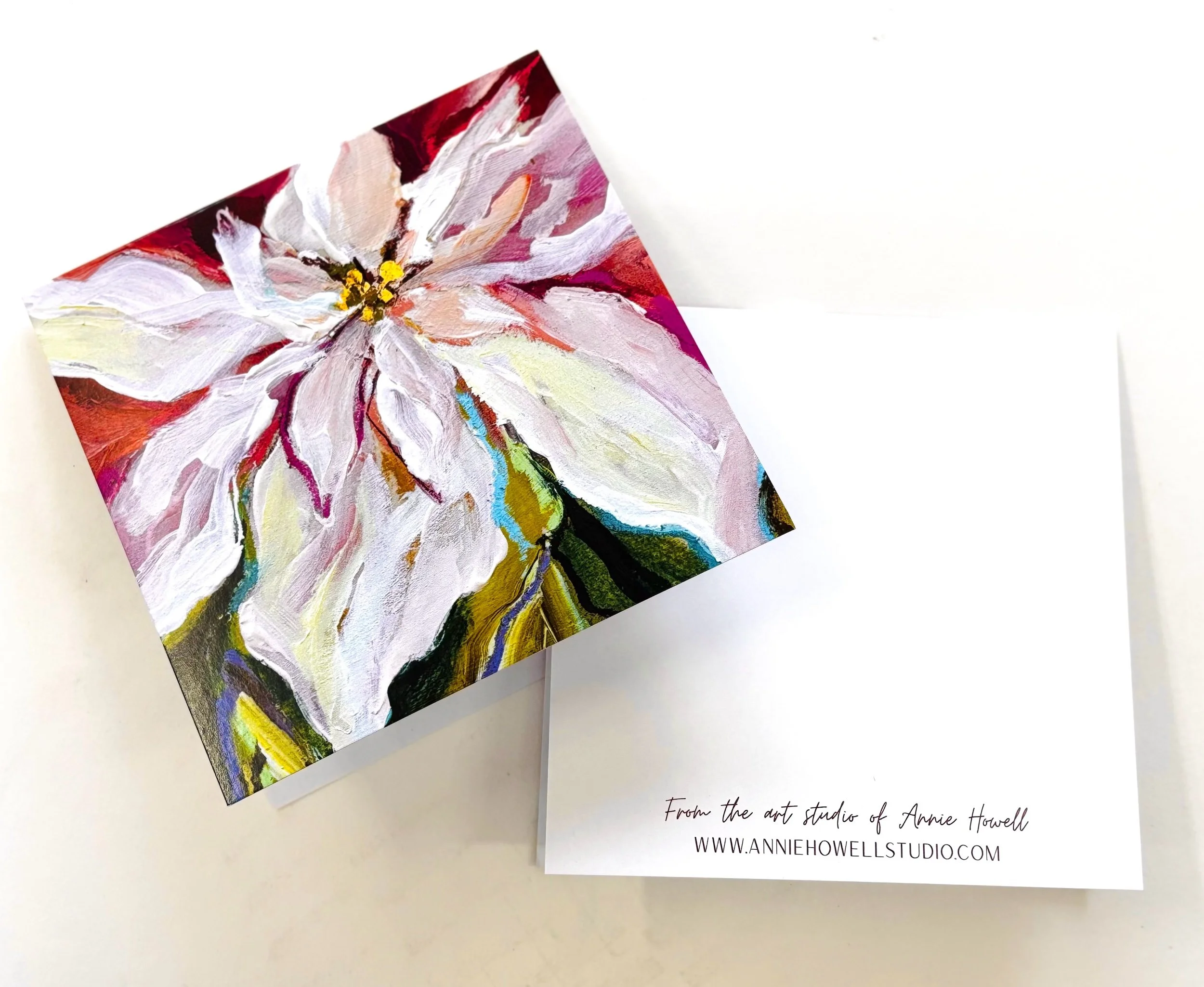 Bring a touch of artful beauty to every message with this set of 6 fine art notecards, each featuring a vibrant print of Annie Howell’s original mixed-media poinsettia paintings. Perfect for thank-you notes, holiday messages, hostess gifts, or adding a little joy to everyday correspondence, these cards are designed to celebrate color, texture, and heartfelt connection.
